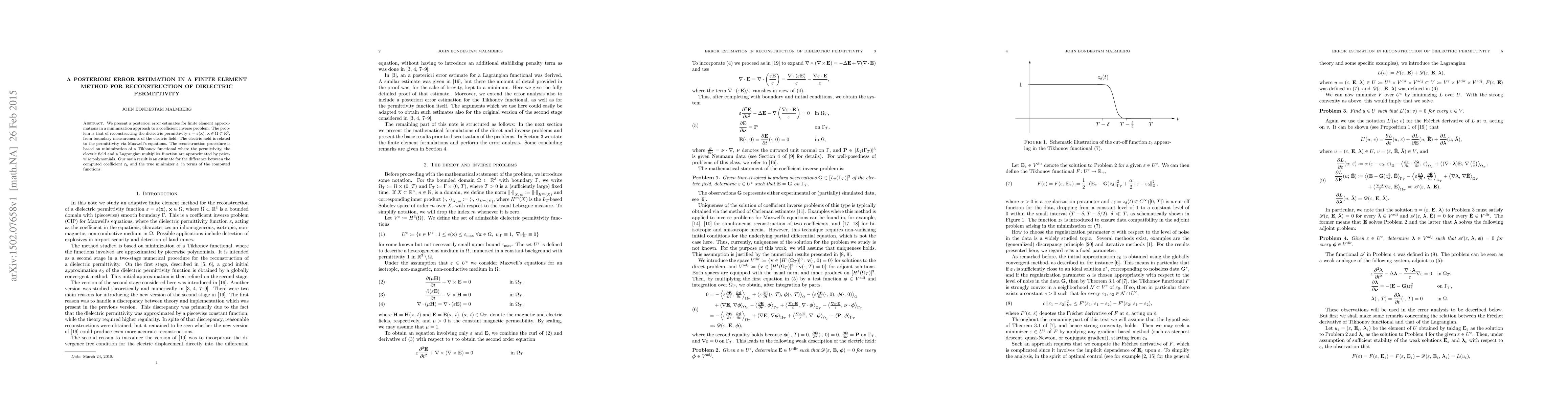We present a posteriori error estimates for finite element approximations in a minimization approach to a coefficient inverse problem. The problem is that of reconstructing the dielectric permittivity $\varepsilon = \varepsilon(\mathbf{x})$, $\mathbf{x}\in\Omega\subset\mathbb{R}^3$, from boundary measurements of the electric field. The electric field is related to the permittivity via Maxwell's equations. The reconstruction procedure is based on minimization of a Tikhonov functional where the permittivity, the electric field and a Lagrangian multiplier function are approximated by peicewise polynomials. Our main result is an estimate for the difference between the computed coefficient $\varepsilon_h$ and the true minimizer $\varepsilon$, in terms of the computed functions.