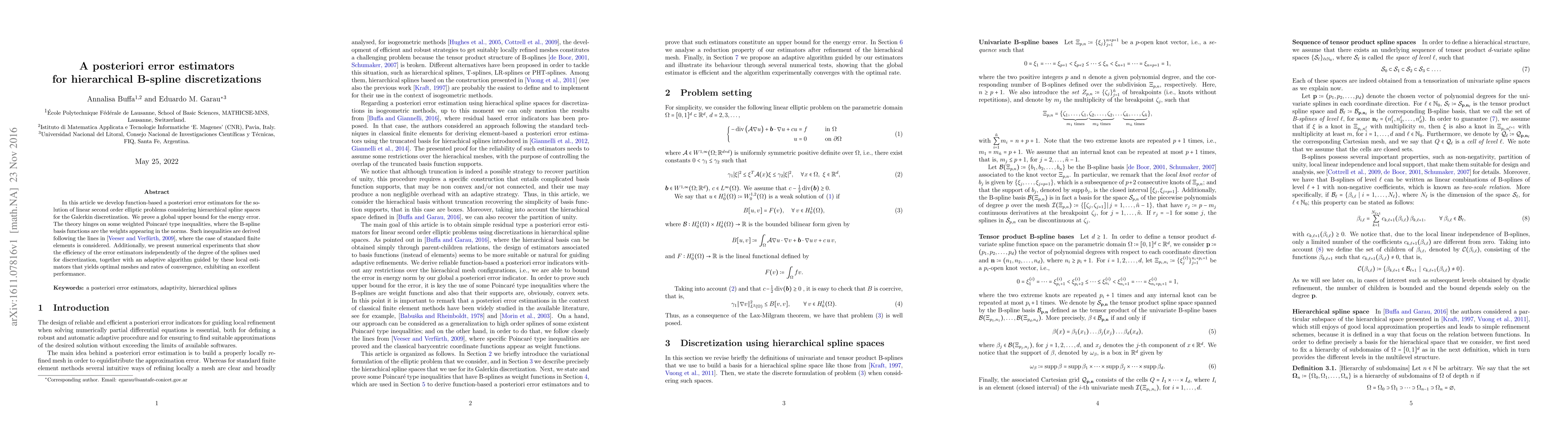 This paper develops function-based a posteriori error estimators for linear second-order elliptic problems using hierarchical B-spline discretizations. It proves a global upper bound for the energy error, leveraging weighted Poincaré inequalities, and demonstrates the estimators' efficiency through numerical experiments and an adaptive algorithm.
