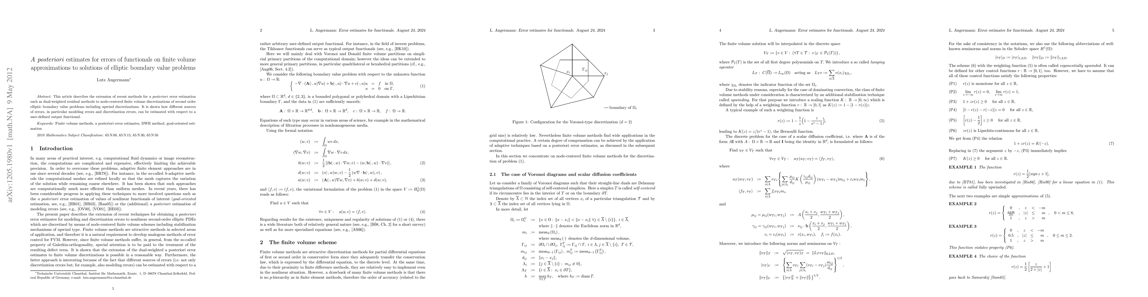 This paper extends a posteriori error estimation methods, including dual-weighted residual techniques, to node-centered finite volume approximations for elliptic boundary value problems, addressing both modeling and discretization errors in relation to user-defined output functionals. The approach is applicable to second order problems, including upwind discretizations.