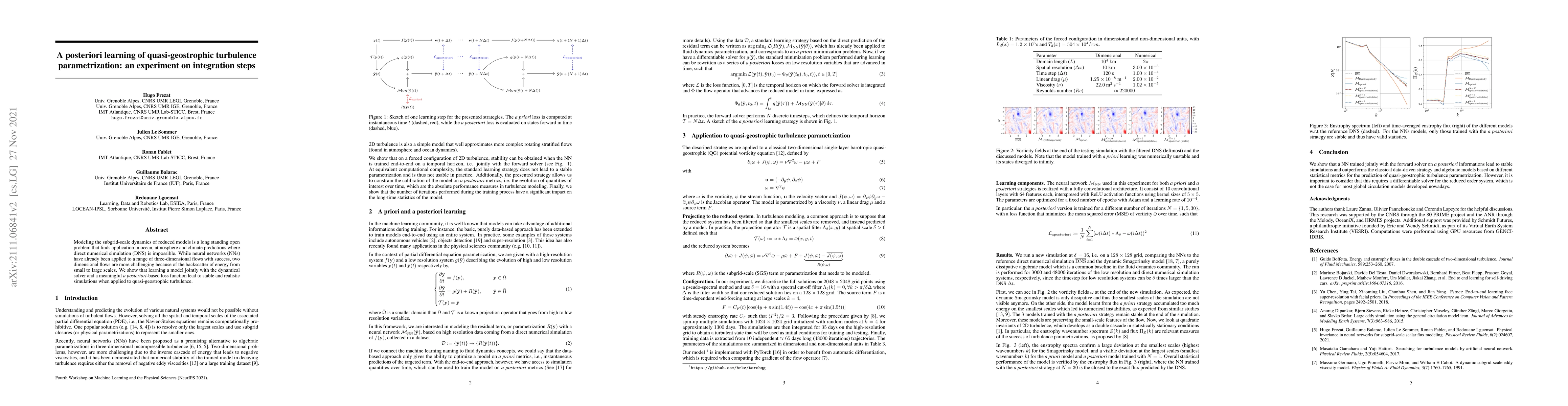 Modeling the subgrid-scale dynamics of reduced models is a long standing open problem that finds application in ocean, atmosphere and climate predictions where direct numerical simulation (DNS) is impossible. While neural networks (NNs) have already been applied to a range of three-dimensional flows with success, two dimensional flows are more challenging because of the backscatter of energy from small to large scales. We show that learning a model jointly with the dynamical solver and a meaningful \textit{a posteriori}-based loss function lead to stable and realistic simulations when applied to quasi-geostrophic turbulence.