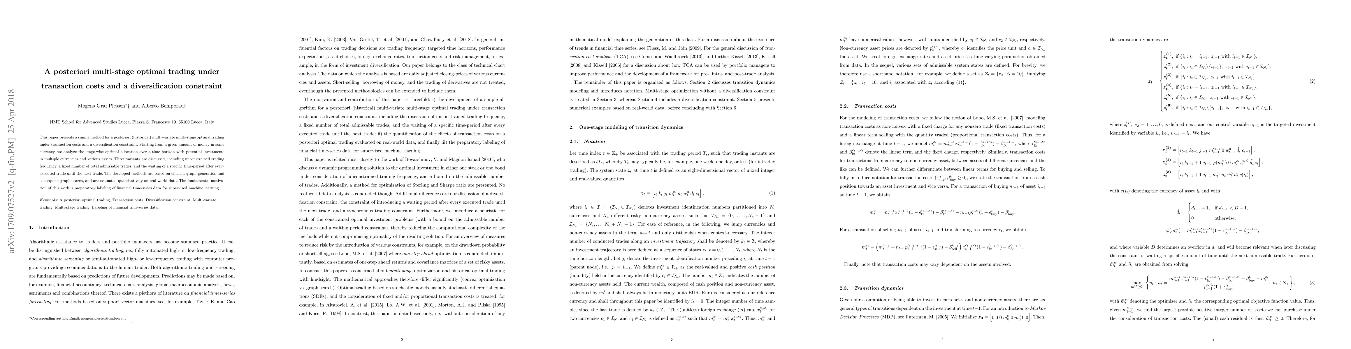 This paper proposes a method for historical multi-stage optimal trading under transaction costs and a diversification constraint, employing graph generation and search techniques. The approach is evaluated on real-world data to prepare financial time-series for supervised machine learning.