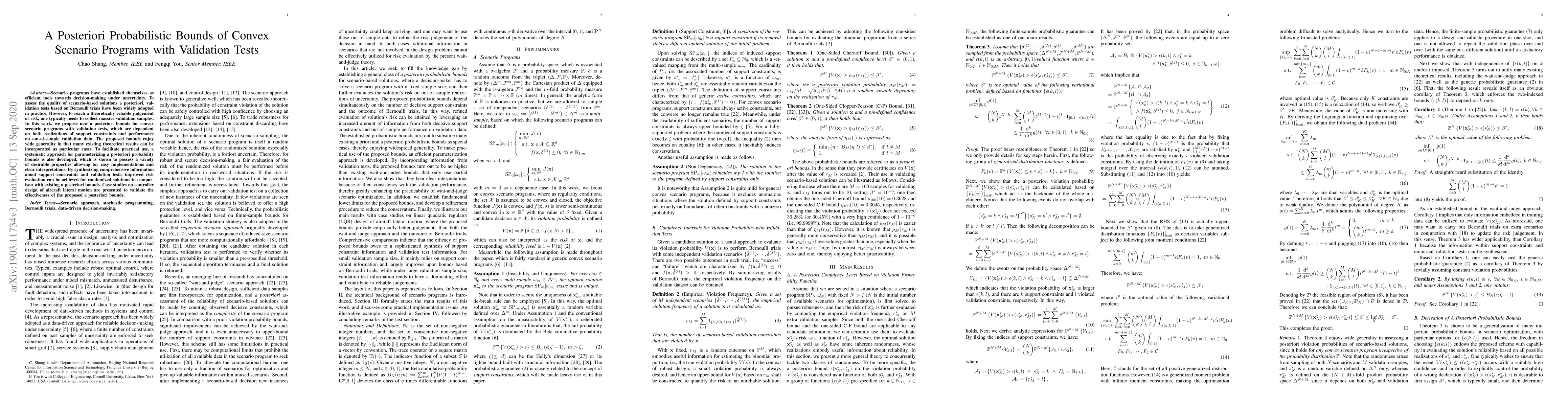This paper proposes new a posteriori probabilistic bounds for convex scenario programs that incorporate validation tests, improving risk evaluation through synthesized information from support constraints and validation data. The developed bounds generalize existing results and offer practical parameterization for easy implementation and clear interpretation, validated through case studies on aircraft lateral motion control.