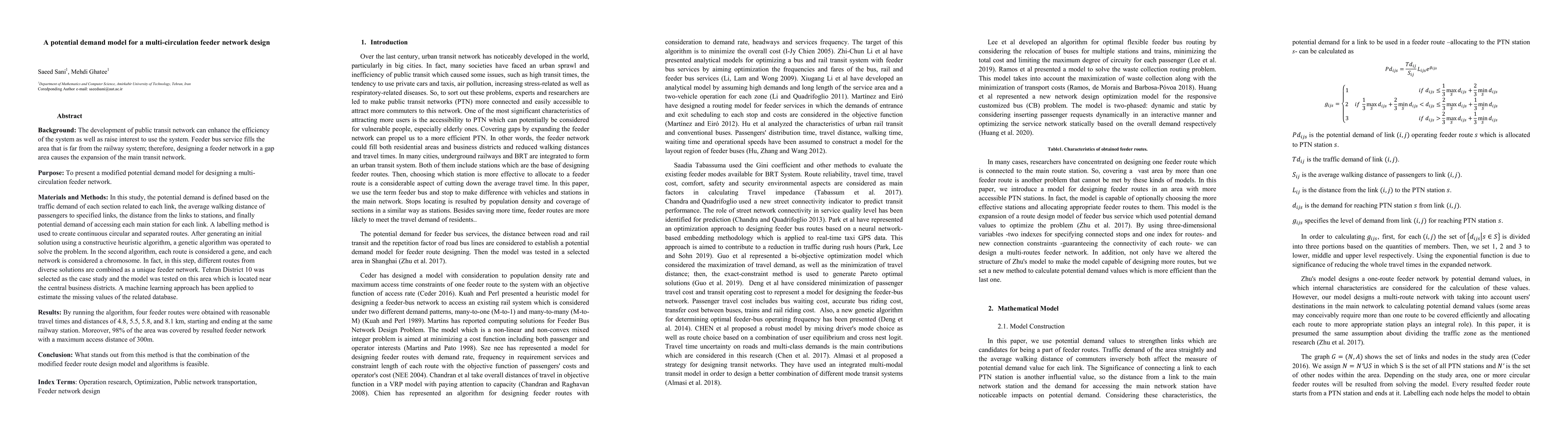 Background: The development of public transit network can enhance the efficiency of the system as well as raise interest to use the system. Feeder bus service fills the area that is far from the railway system; therefore, designing a feeder network in a gap area causes the expansion of the main transit network. Purpose: To present a modified potential demand model for designing a multi-circulation feeder network. Materials and Methods: In this study, the potential demand is defined based on the traffic demand of each section related to each link, the average walking distance of passengers to specified links, the distance from the links to stations, and finally potential demand of accessing each main station for each link. A labelling method is used to create continuous circular and separated routes. After generating an initial solution using a constructive heuristic algorithm, a genetic algorithm was operated to solve the problem. In the second algorithm, each route is considered a gene, and each network is considered a chromosome. In fact, in this step, different routes from diverse solutions are combined as a unique feeder network. Tehran District 10 was selected as the case study and the model was tested on this area which is located near the central business districts. A machine learning approach has been applied to estimate the missing values of the related database. Results: By running the algorithm, four feeder routes were obtained with reasonable travel times and distances of 4.8, 5.5, 5.8, and 8.1 km, starting and ending at the same railway station. Moreover, 98% of the area was covered by resulted feeder network with a maximum access distance of 300m. Conclusion: What stands out from this method is that the combination of the modified feeder route design model and algorithms is feasible.