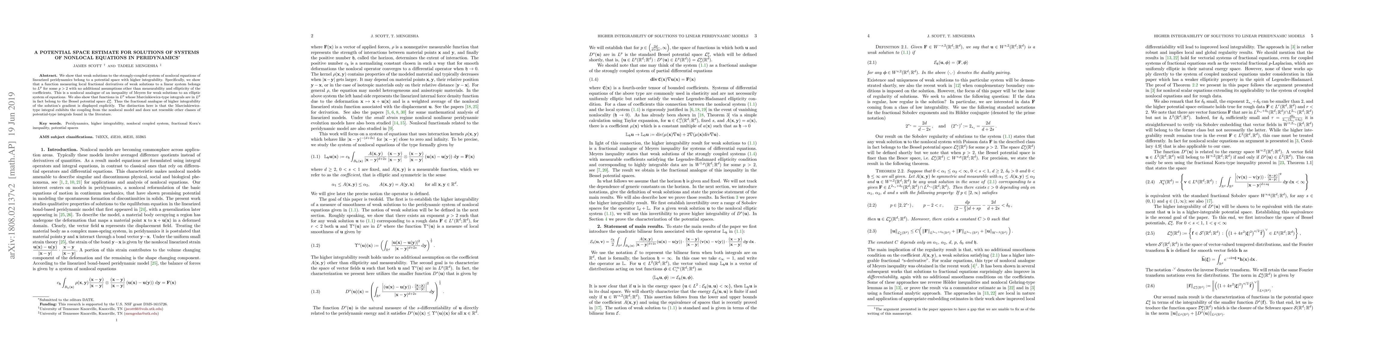 We show that weak solutions to the strongly-coupled system of nonlocal equations of linearized peridynamics belong to a potential space with higher integrability. Specifically, we show a function that measures local fractional derivatives of weak solutions to a linear system belongs to $L^p$ for some $p > 2$ with no additional assumption other than measurability and ellipticity of coefficients. This is a nonlocal analogue of an inequality of Meyers for weak solutions to an elliptic system of equations. We also show that functions in $L^p$ whose Marcinkiewicz-type integrals are in $L^p$ in fact belong to the Bessel potential space $\mathcal{L}^{p}_s$. Thus the fractional analogue of higher integrability of the solution's gradient is displayed explicitly. The distinction here is that the Marcinkiewicz-type integral exhibits the coupling from the nonlocal model and does not resemble other classes of potential-type integrals found in the literature.
