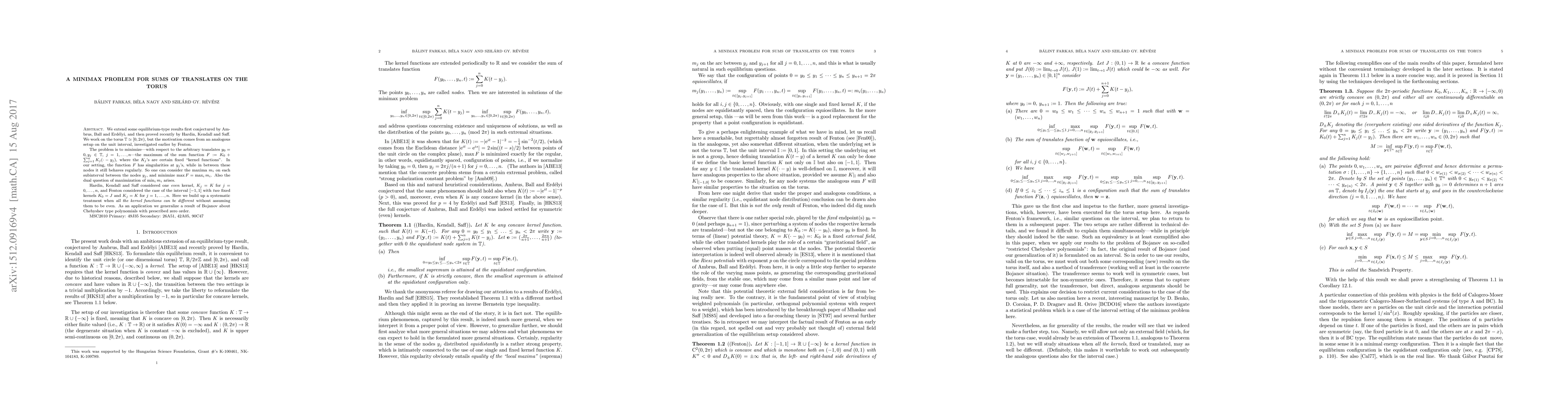 We investigate an extension of an equilibrium-type result, conjectured by Ambrus, Ball and Erd\'elyi, and proved recently by Hardin, Kendall and Saff. These results were formulated on the torus, hence we also work on the torus, but one of the main motivations for our extension comes from an analogous setup on the unit interval, investigated earlier by Fenton. Basically, the problem is a minimax one, i.e. to minimize the maximum of a function $F$, defined as the sum of arbitrary translates of certain fixed "kernel functions", minimization understood with respect to the translates. If these kernels are assumed to be concave, having certain singularities or cusps at zero, then translates by $y_j$ will have singularities at $y_j$ (while in between these nodes the sum function still behaves realtively regularly). So one can consider the maxima $m_i$ on each subintervals between the nodes $y_j$, and look for the minimization of $\max F = \max_i m_i$. Here also a dual question of maximization of $\min_i m_i$ arises. This type of minimax problems were treated under some additional assumptions on the kernels. Also the problem is normalized so that $y_0=0$. In particular, Hardin, Kendall and Saff assumed that we have one single kernel $K$ on the torus or circle, and $F=\sum_{j=0}^n K(\cdot-y_j)= K + \sum_{j=1}^n K(\cdot-y_j)$. Fenton considered situations on the interval with two fixed kernels $J$ and $K$, also satisfying additional assumptions, and $F= J + \sum_{j=1}^n K(\cdot-y_j)$. Here we consider the situation (on the circle) when \emph{all the kernel functions can be different}, and $F=\sum_{j=0}^n K_j(\cdot- y_j) = K_0 + \sum_{j=1}^n K_j(\cdot-y_j)$. Also an emphasis is put on relaxing all other technical assumptions and give alternative, rather minimal variants of the set of conditions on the kernel.