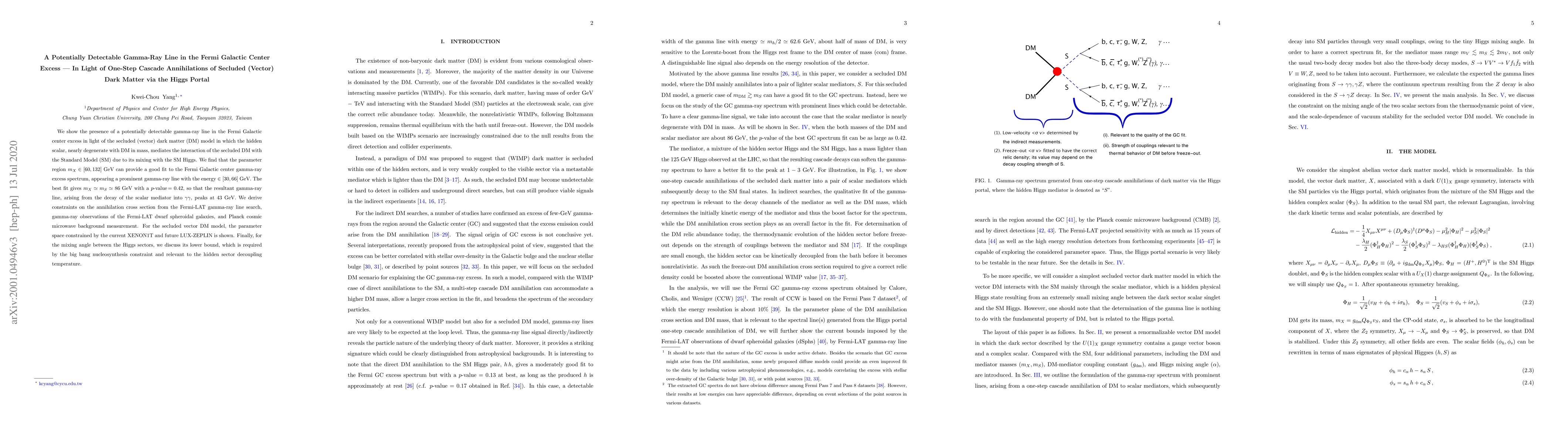 This paper investigates a potentially detectable gamma-ray line in the Fermi Galactic center excess, suggesting it could arise from one-step cascade annihilations of secluded vector dark matter via the Higgs portal. The study finds that a dark matter mass within the range of 60 to 132 GeV can fit the observed spectrum, with a prominent gamma-ray line at around 43 GeV, and derives constraints on the annihilation cross section and the mixing angle between Higgs sectors.