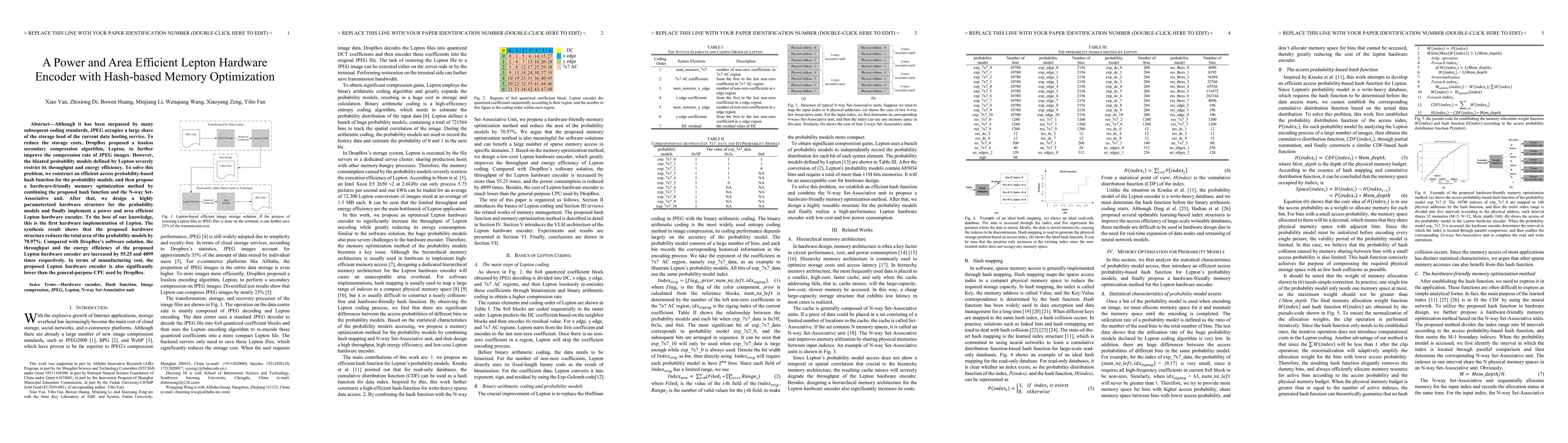 Although it has been surpassed by many subsequent coding standards, JPEG occupies a large share of the storage load of the current data hosting service. To reduce the storage costs, DropBox proposed a lossless secondary compression algorithm, Lepton, to further improve the compression rate of JPEG images. However, the bloated probability models defined by Lepton severely restrict its throughput and energy efficiency. To solve this problem, we construct an efficient access probability-based hash function for the probability models, and then propose a hardware-friendly memory optimization method by combining the proposed hash function and the N-way Set-Associative unit. After that, we design a highly parameterized hardware structure for the probability models and finally implement a power and area efficient Lepton hardware encoder. To the best of our knowledge, this is the first hardware implementation of Lepton. The synthesis result shows that the proposed hardware structure reduces the total area of the probability models by 70.97%. Compared with DropBox's software solution, the throughput and the energy efficiency of the proposed Lepton hardware encoder are increased by 55.25 and 4899 times respectively. In terms of manufacturing cost, the proposed Lepton hardware encoder is also significantly lower than the general-purpose CPU used by DropBox.