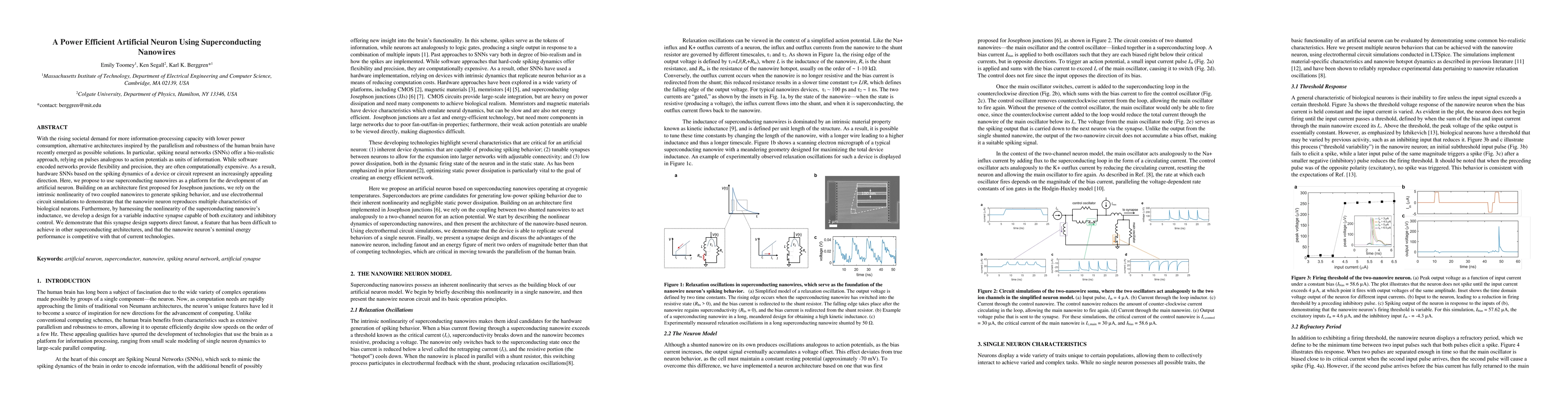 Researchers propose a power-efficient artificial neuron using superconducting nanowires, demonstrating competitive energy performance with current technologies, and develop a variable inductive synapse design for both excitatory and inhibitory control.