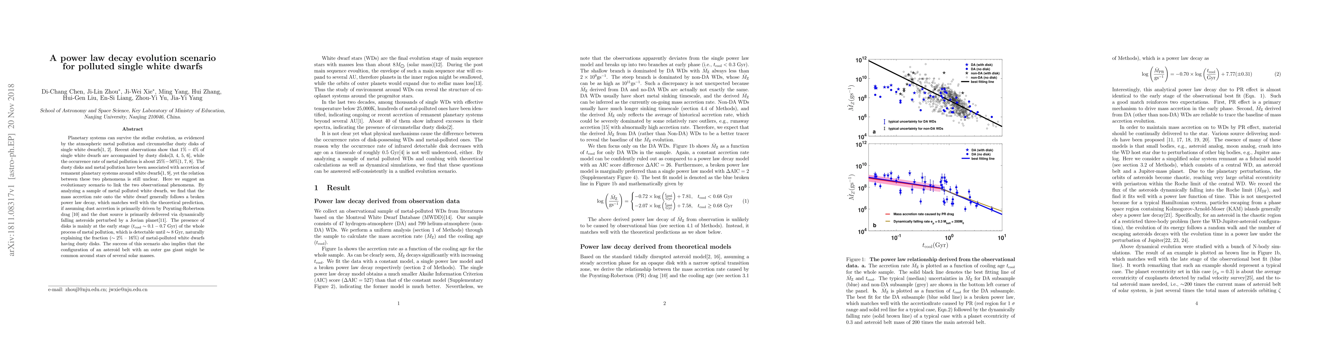 This paper proposes an evolutionary model linking dusty disks and metal pollution in single white dwarfs, suggesting that the mass accretion rate follows a broken power law decay. The model explains the presence of disks early in the process and predicts that the configuration of an asteroid belt with a gas giant is common around stars of several solar masses.