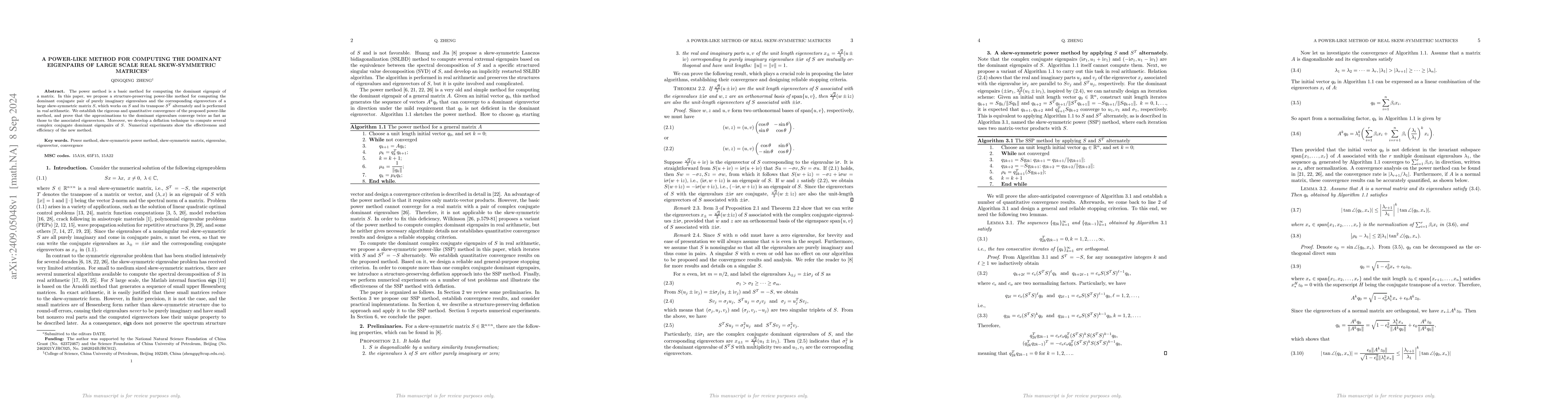 This paper introduces a power-like method for computing the dominant conjugate pair of purely imaginary eigenvalues of large skew-symmetric matrices, showing faster convergence for eigenvalues and developing a deflation technique for multiple eigenpairs. Numerical experiments validate the method's effectiveness.