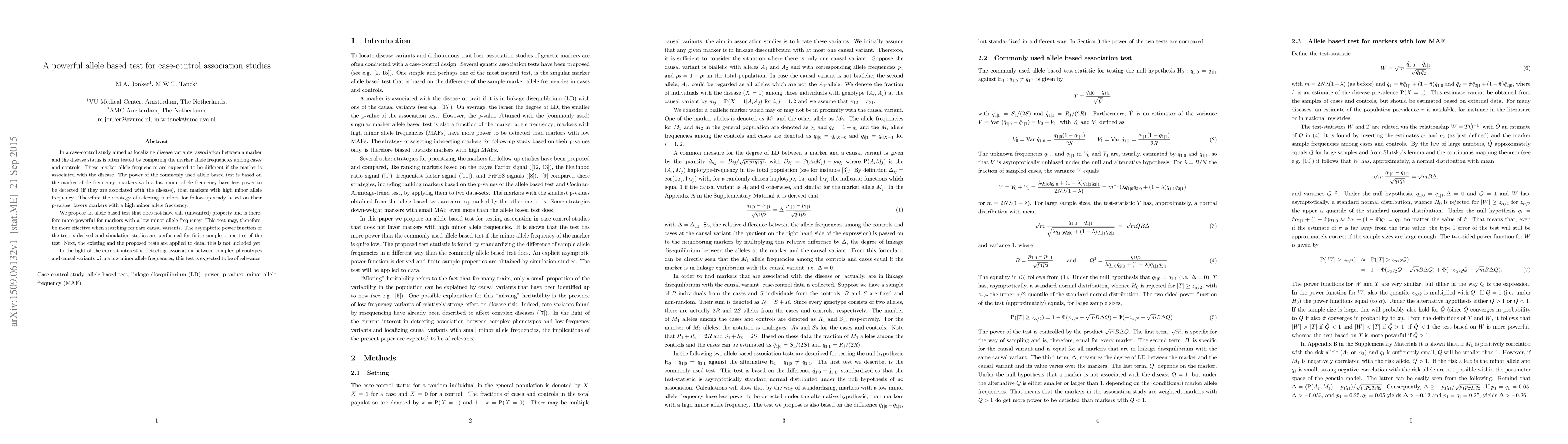 In a case-control study aimed at localizing disease variants, association between a marker and the disease status is often tested by comparing the marker allele frequencies among cases and controls. These marker allele frequencies are expected to be different if the marker is associated with the disease. The power of the commonly used allele based test is based on the marker allele frequency; markers with a low minor allele frequency have less power to be detected (if they are associated with the disease), than markers with high minor allele frequency. Therefore the strategy of selecting markers for follow-up study based on their p-values, favors markers with a high minor allele frequency. We propose an allele based test that does not have this (unwanted) property and is therefore more powerful for markers with a low minor allele frequency. This test may, therefore, be more effective when searching for rare causal variants. The asymptotic power function of the test is derived and simulation studies are performed for finite sample properties of the test. Next, the existing and the proposed tests are applied to data; this is not included yet. In the light of the current interest in detecting association between complex phenotypes and causal variants with a low minor allele frequencies, this test is expected to be of relevance.