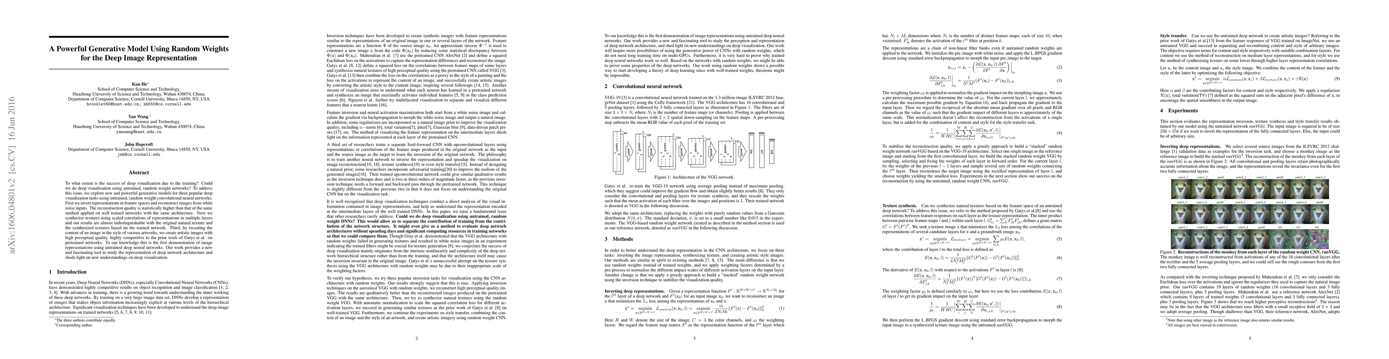 To what extent is the success of deep visualization due to the training? Could we do deep visualization using untrained, random weight networks? To address this issue, we explore new and powerful generative models for three popular deep visualization tasks using untrained, random weight convolutional neural networks. First we invert representations in feature spaces and reconstruct images from white noise inputs. The reconstruction quality is statistically higher than that of the same method applied on well trained networks with the same architecture. Next we synthesize textures using scaled correlations of representations in multiple layers and our results are almost indistinguishable with the original natural texture and the synthesized textures based on the trained network. Third, by recasting the content of an image in the style of various artworks, we create artistic images with high perceptual quality, highly competitive to the prior work of Gatys et al. on pretrained networks. To our knowledge this is the first demonstration of image representations using untrained deep neural networks. Our work provides a new and fascinating tool to study the representation of deep network architecture and sheds light on new understandings on deep visualization.