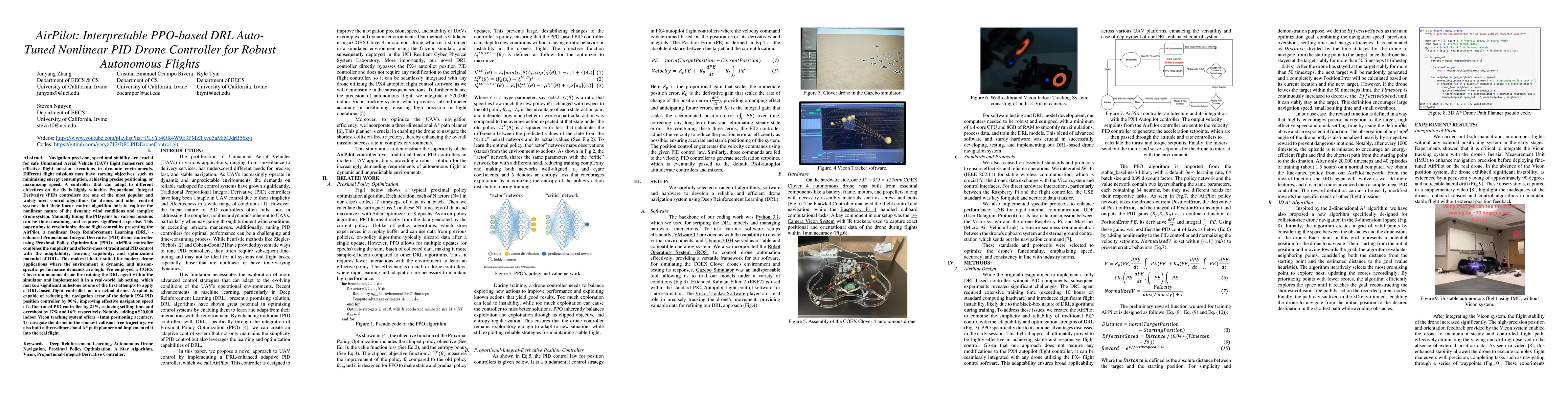 This project aims to revolutionize drone flight control by implementing a nonlinear Deep Reinforcement Learning (DRL) agent as a replacement for traditional linear Proportional Integral Derivative (PID) controllers. The primary objective is to seamlessly transition drones between manual and autonomous modes, enhancing responsiveness and stability. We utilize the Proximal Policy Optimization (PPO) reinforcement learning strategy within the Gazebo simulator to train the DRL agent. Adding a $20,000 indoor Vicon tracking system offers <1mm positioning accuracy, which significantly improves autonomous flight precision. To navigate the drone in the shortest collision-free trajectory, we also build a 3 dimensional A* path planner and implement it into the real flight successfully.