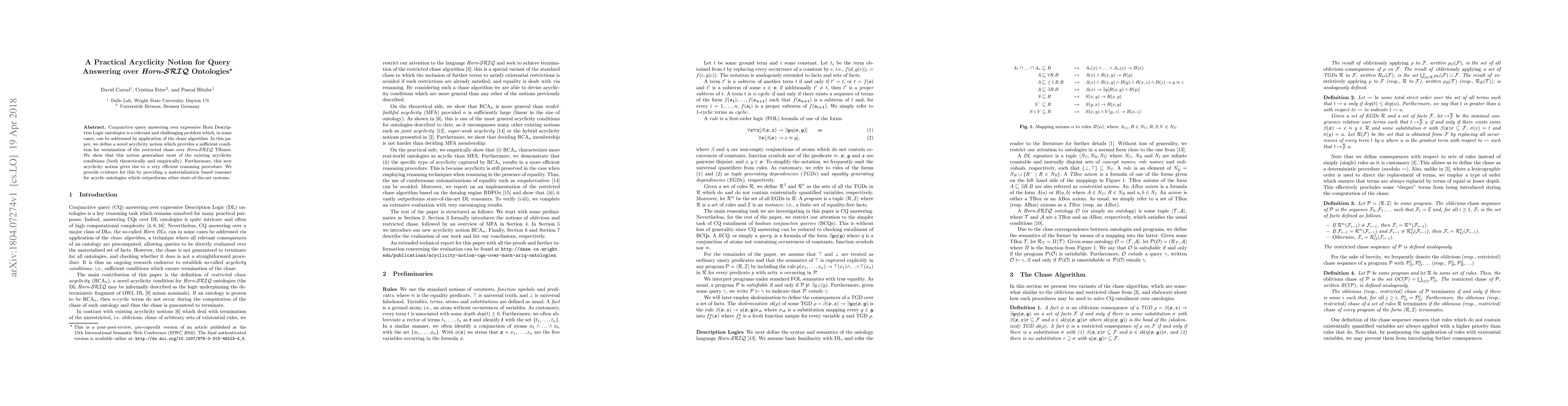 Conjunctive query answering over expressive Horn Description Logic ontologies is a relevant and challenging problem which, in some cases, can be addressed by application of the chase algorithm. In this paper, we define a novel acyclicity notion which provides a sufficient condition for termination of the restricted chase over Horn-SRIQ TBoxes. We show that this notion generalizes most of the existing acyclicity conditions (both theoretically and empirically). Furthermore, this new acyclicity notion gives rise to a very efficient reasoning procedure. We provide evidence for this by providing a materialization based reasoner for acyclic ontologies which outperforms other state-of-the-art systems.