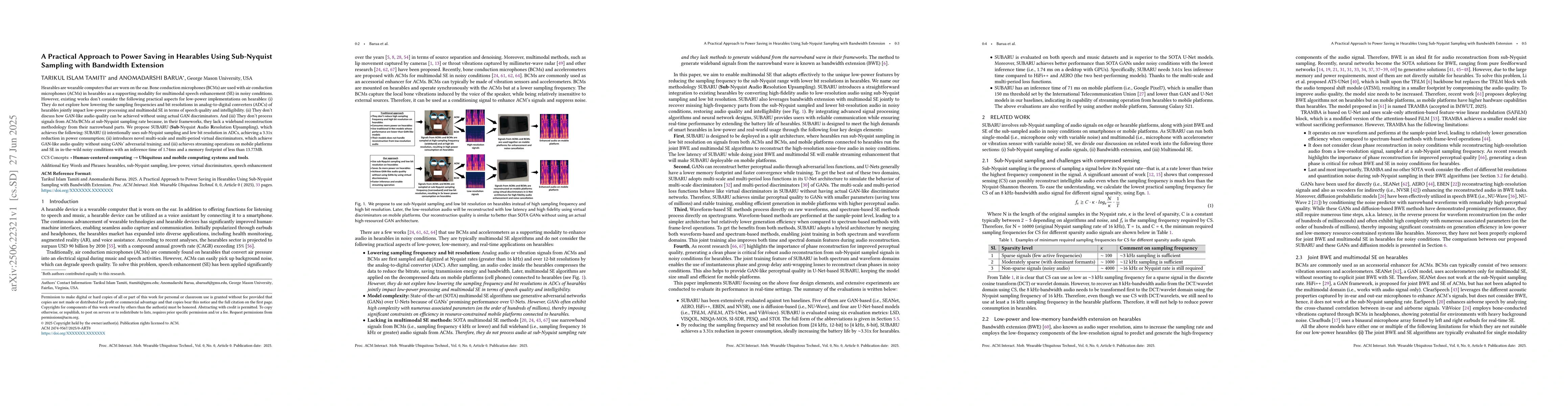 The research introduces SUBARU, a method for power-efficient hearable devices using sub-Nyquist sampling and low bit resolution in ADCs, reducing power consumption by 3.31x. SUBARU also achieves high-quality audio via novel virtual discriminators, without the need for GANs, and performs speech enhancement in noisy conditions with minimal latency and memory usage.