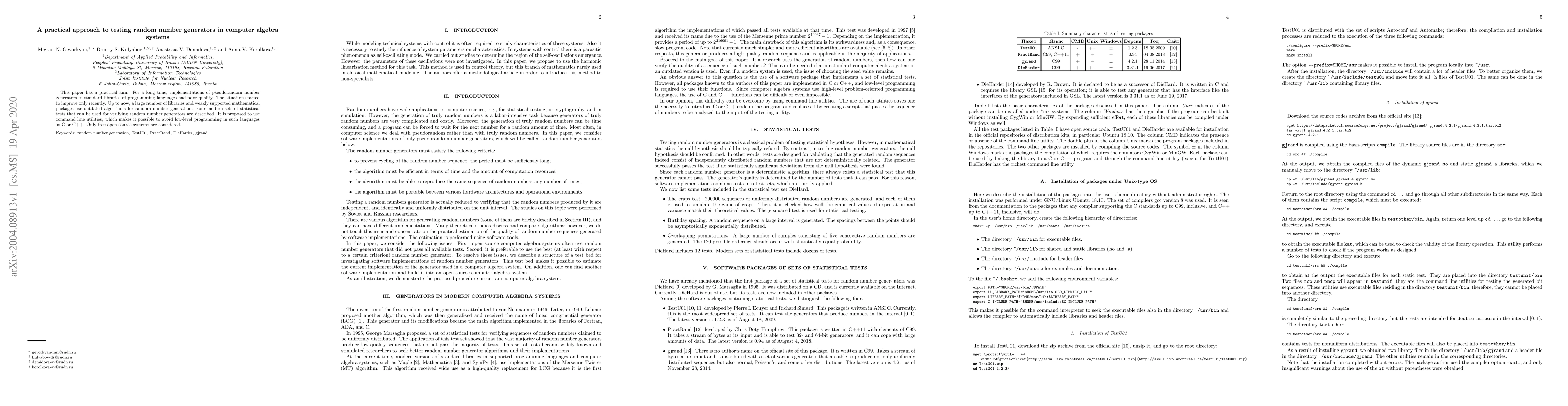 This paper proposes a practical approach to testing the quality of pseudorandom number generators in computer algebra systems, focusing on modern statistical tests and free open source command line utilities to avoid low-level programming. It emphasizes the need for improved random number generation in outdated libraries.