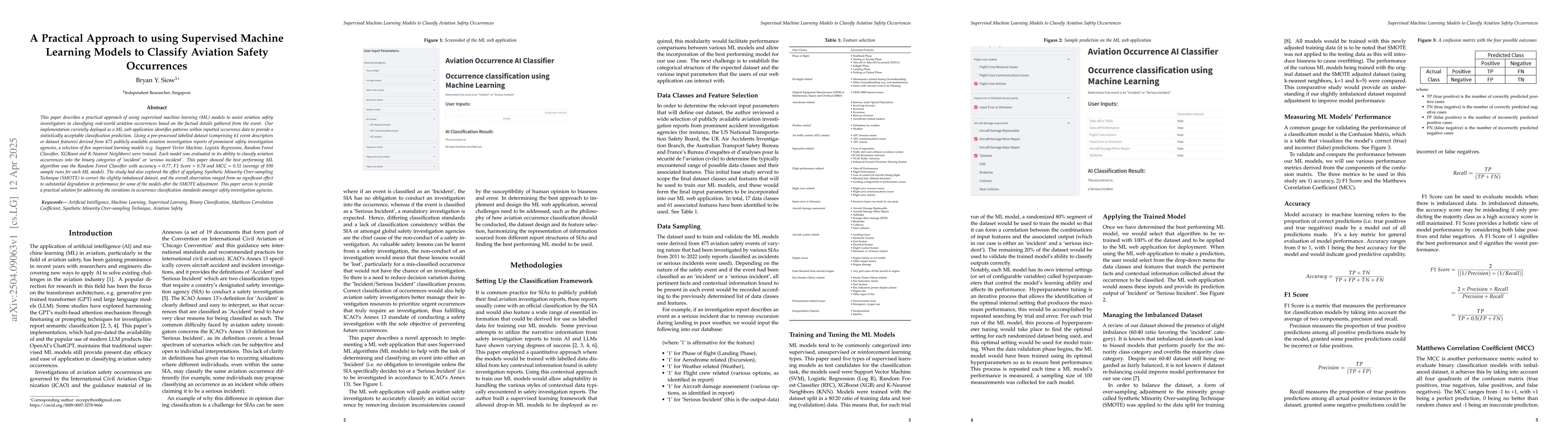 The paper presents a practical approach to using supervised machine learning models for classifying aviation safety occurrences, demonstrating the Random Forest Classifier as the best-performing algorithm in this context.