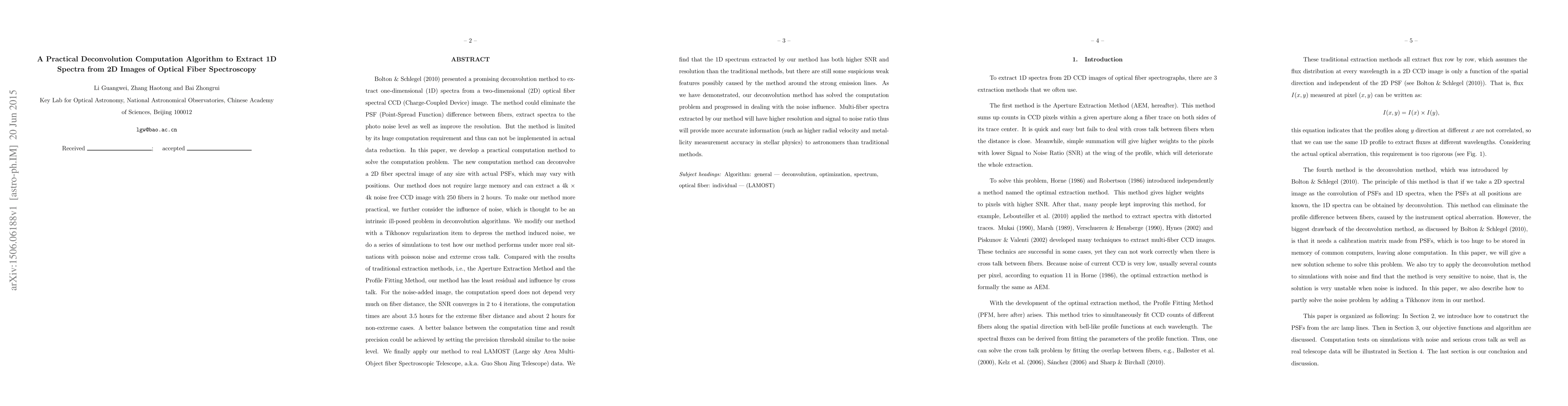 This paper presents a practical deconvolution algorithm to efficiently extract 1D spectra from 2D optical fiber spectral CCD images, addressing computational limitations of previous methods. The new approach uses Tikhonov regularization to manage noise and can process large images with many fibers in a reasonable time frame, achieving higher resolution and signal-to-noise ratio compared to traditional methods.