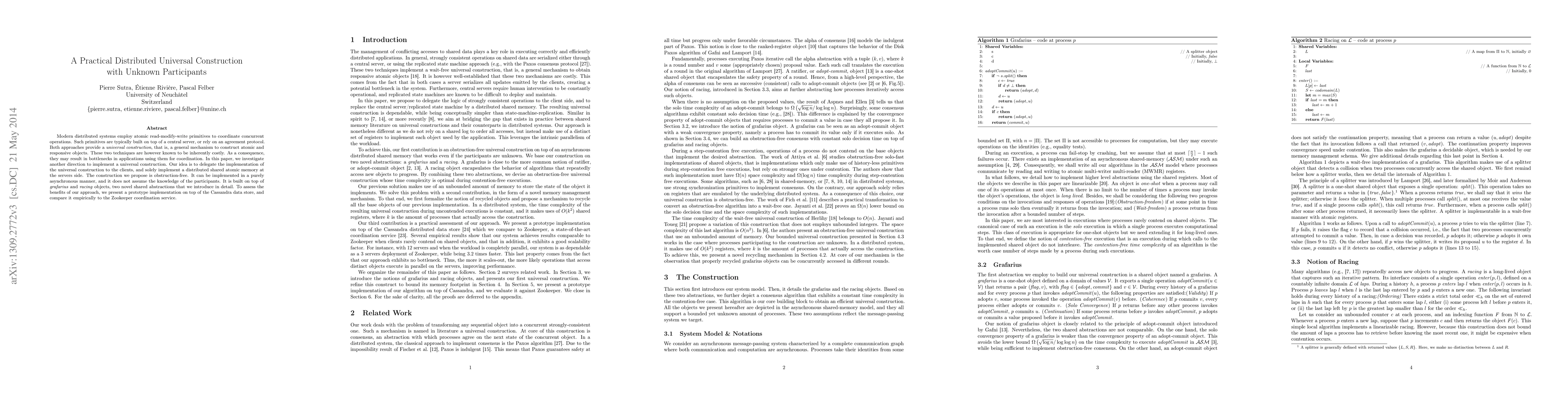 Modern distributed systems employ atomic read-modify-write primitives to coordinate concurrent operations. Such primitives are typically built on top of a central server, or rely on an agreement protocol. Both approaches provide a universal construction, that is, a general mechanism to construct atomic and responsive objects. These two techniques are however known to be inherently costly. As a consequence, they may result in bottlenecks in applications using them for coordination. In this paper, we investigate another direction to implement a universal construction. Our idea is to delegate the implementation of the universal construction to the clients, and solely implement a distributed shared atomic memory at the servers side. The construction we propose is obstruction-free. It can be implemented in a purely asynchronous manner, and it does not assume the knowledge of the participants. It is built on top of grafarius and racing objects, two novel shared abstractions that we introduce in detail. To assess the benefits of our approach, we present a prototype implementation on top of the Cassandra data store, and compare it empirically to the Zookeeper coordination service.