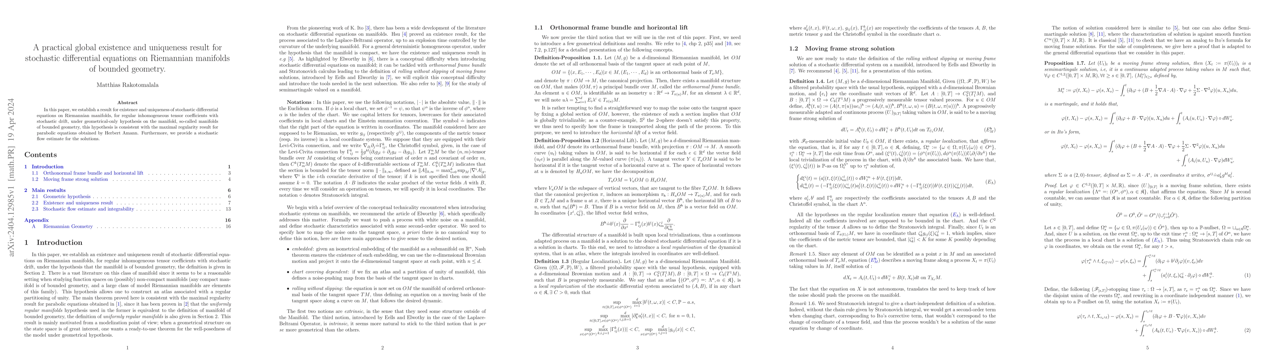 In this paper, we establish a result for existence and uniqueness of stochastic differential equations on Riemannian manifolds, for regular inhomogeneous tensor coefficients with stochastic drift, under geometrical-only hypothesis on the manifold, so-called manifolds of bounded geometry, this hypothesis is consistent with the maximal regularity result for parabolic equations obtained by Herbert Amann. Furthermore, we provide a stochastic flow estimate for the solutions.