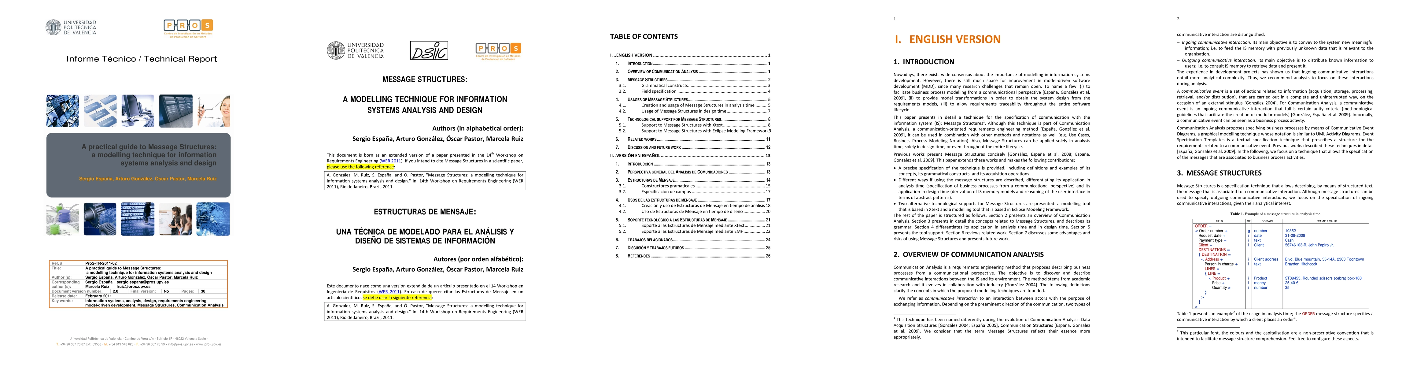 Despite the increasing maturity of model-driven software development (MDD), some research challenges remain open in the field of information systems (IS). For instance, there is a need to improve modelling techniques so that they cover several development stages in an integrated way, and they facilitate the transition from analysis to design. This paper presents Message Structures, a technique for the specification of communicative interactions between the IS and organisational actors. This technique can be used both in the analysis stage and in the design stage. During analysis, it allows abstracting from the technology that will support the IS, and to complement business process diagramming techniques with the specification of the communicational needs of the organisation. During design, Message Structures serves two purposes: (i) it allows to systematically derive a specification of the IS memory (e.g. a UML class diagram), (ii) and it allows to reason the user interface design using abstract patterns. This technique is part of Communication Analysis, a communication-oriented requirements engineering method, but it can be adopted in order to extend widely-used business process and functional requirements modelling techniques (e.g. BPMN, Use Cases). Moreover, the paper presents two tools that support Message Structures, one uses the Xtext technology, and the other uses the Eclipse Modelling Framework. Industrial experience has shown us that the technique can be adopted and applied in complex projects.