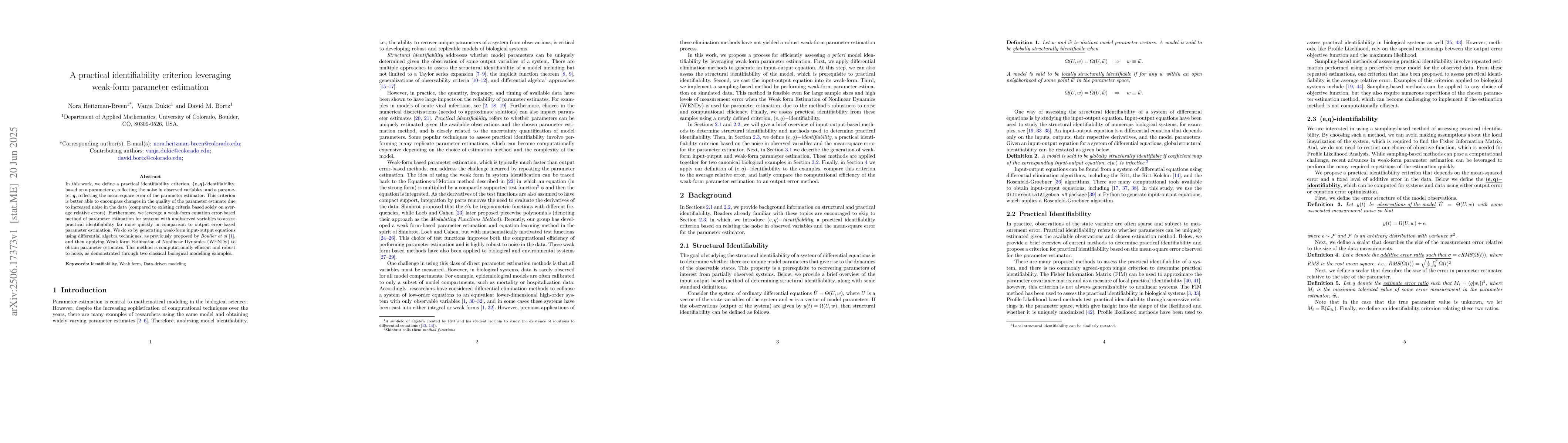 In this work, we define a practical identifiability criterion, (e, q)-identifiability, based on a parameter e, reflecting the noise in observed variables, and a parameter q, reflecting the mean-square error of the parameter estimator. This criterion is better able to encompass changes in the quality of the parameter estimate due to increased noise in the data (compared to existing criteria based solely on average relative errors). Furthermore, we leverage a weak-form equation error-based method of parameter estimation for systems with unobserved variables to assess practical identifiability far more quickly in comparison to output error-based parameter estimation. We do so by generating weak-form input-output equations using differential algebra techniques, as previously proposed by Boulier et al [1], and then applying Weak form Estimation of Nonlinear Dynamics (WENDy) to obtain parameter estimates. This method is computationally efficient and robust to noise, as demonstrated through two classical biological modelling examples.