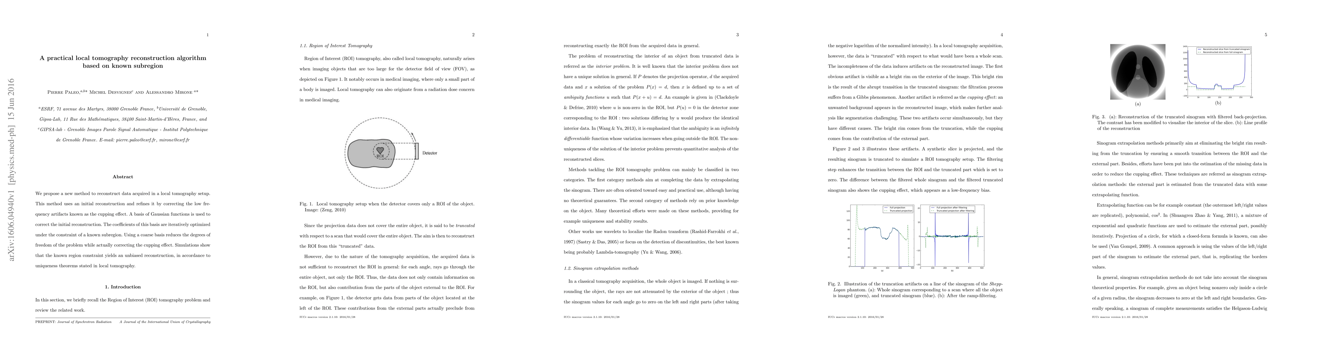 Researchers developed an algorithm to correct low-frequency artifacts in local tomography reconstruction by using a basis of Gaussian functions and optimizing coefficients under a known subregion constraint, resulting in unbiased reconstructions.
