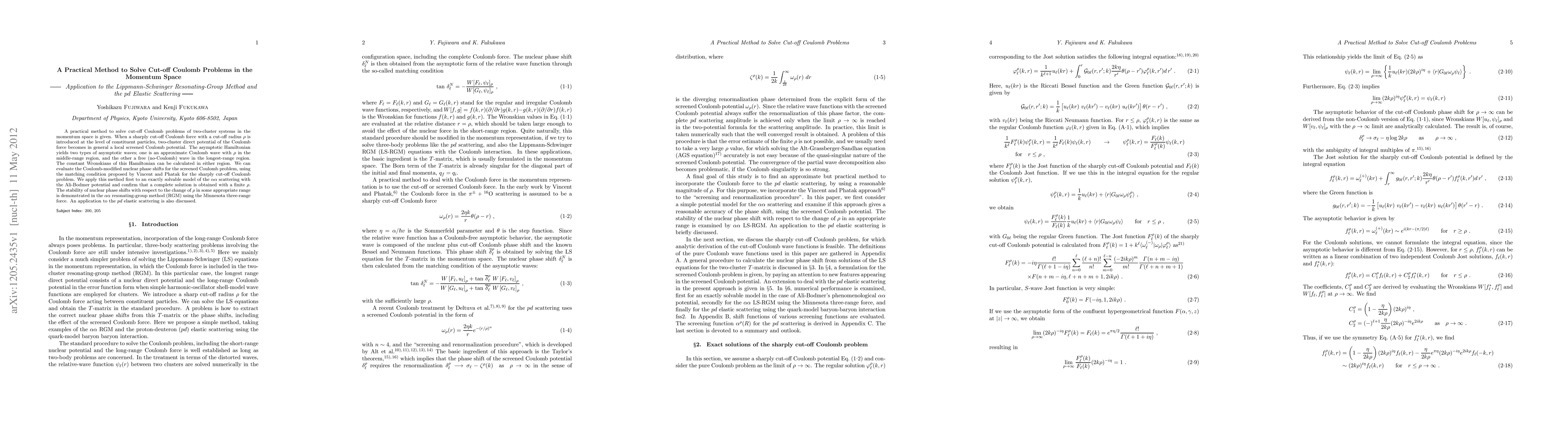 This paper presents a practical method for solving cut-off Coulomb problems in momentum space, specifically applied to the Lippmann-Schwinger resonating-group method. The method evaluates Coulomb-modified nuclear phase shifts for screened Coulomb potentials, demonstrated through $\alpha \alpha$ scattering and extended to pd elastic scattering.