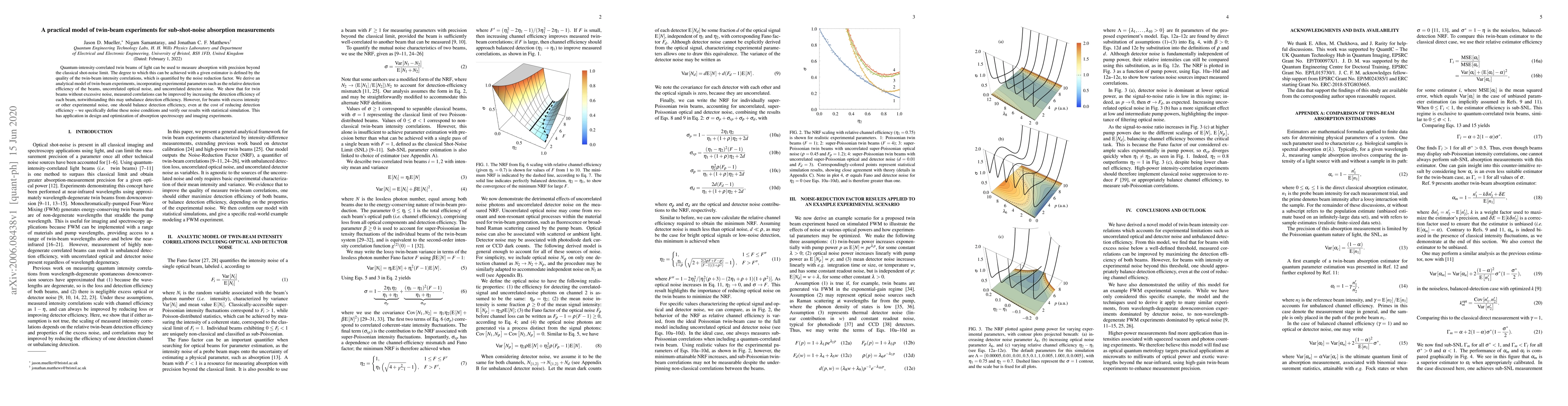 The research derives a practical model for twin-beam experiments to measure absorption beyond the shot-noise limit, incorporating parameters like detection efficiency, uncorrelated optical noise, and detector noise.