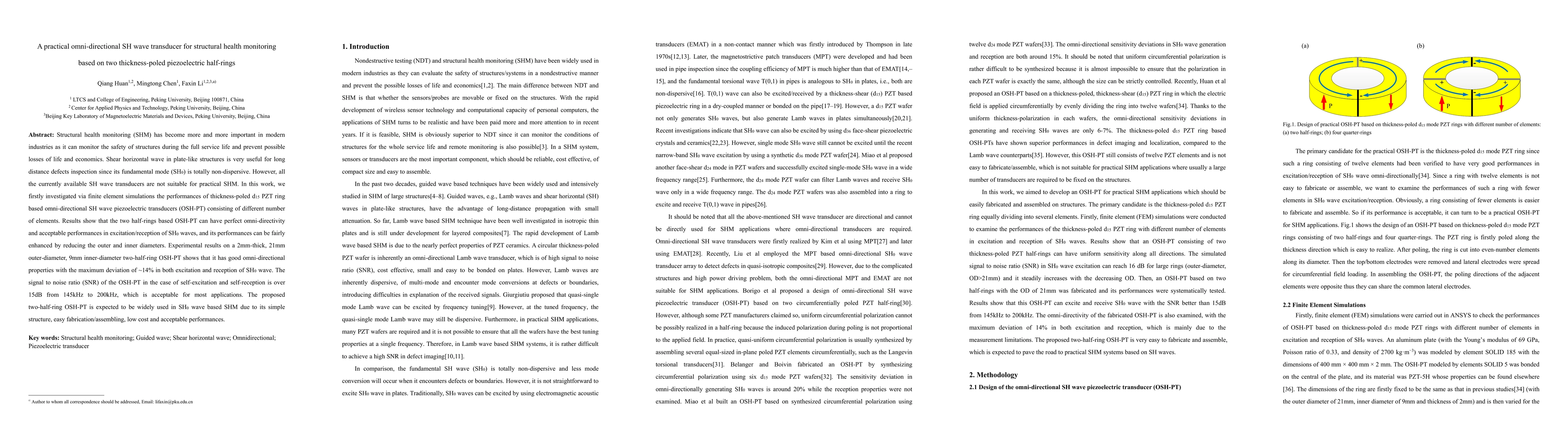 This paper presents a practical omni-directional shear horizontal (SH) wave transducer based on two thickness-poled piezoelectric half-rings for structural health monitoring. Simulation and experimental results show that the proposed transducer has good omni-directional properties and an acceptable signal-to-noise ratio, making it suitable for long-distance defect inspection in plate-like structures.