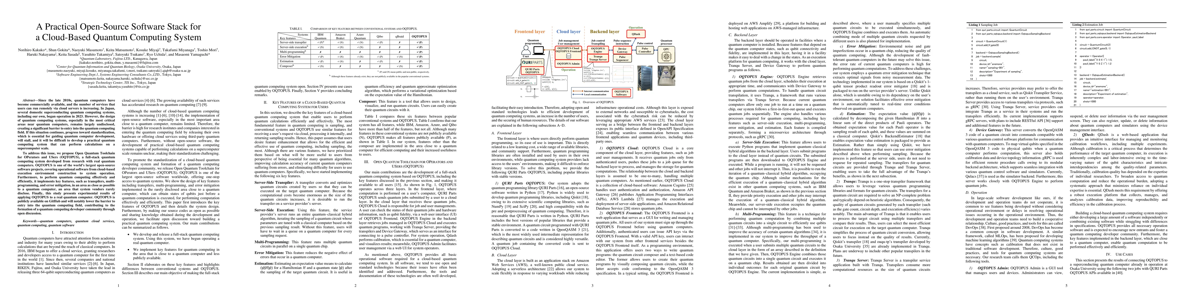 Since the late 2010s, quantum computers have become commercially available, and the number of services that users can run remotely via cloud servers is increasing. In Japan, several domestic superconducting quantum computing systems, including our own, began operation in 2023. However, the design of quantum computing systems, especially in the most critical areas near quantum computers, remains largely undisclosed, creating a significant barrier to entry into the quantum computing field. If this situation continues, progress toward standardization, which is essential for guiding quantum computer development, will stall, and it will be difficult to develop a practical quantum computing system that can perform calculations on a supercomputer scale. To address this issue, we propose Open Quantum Toolchain for OPerators and USers (OQTOPUS), a full-stack quantum computing system developed from research with real quantum computers. OQTOPUS is one of the world's largest open-source software projects, covering operational software from cloud-based execution environment construction to system operation. Furthermore, to perform quantum computing effectively and efficiently, it implements key features, such as transpilers, multiprogramming, and error mitigation, in an area as close as possible to a quantum computer, an area that system vendors rarely disclose. Finally, this study presents experimental results of applying OQTOPUS to a real quantum computer. OQTOPUS is publicly available on GitHub and will notably lower the barrier to entry into the quantum computing field, contributing to the formation of a quantum computing developer community through open discussion.