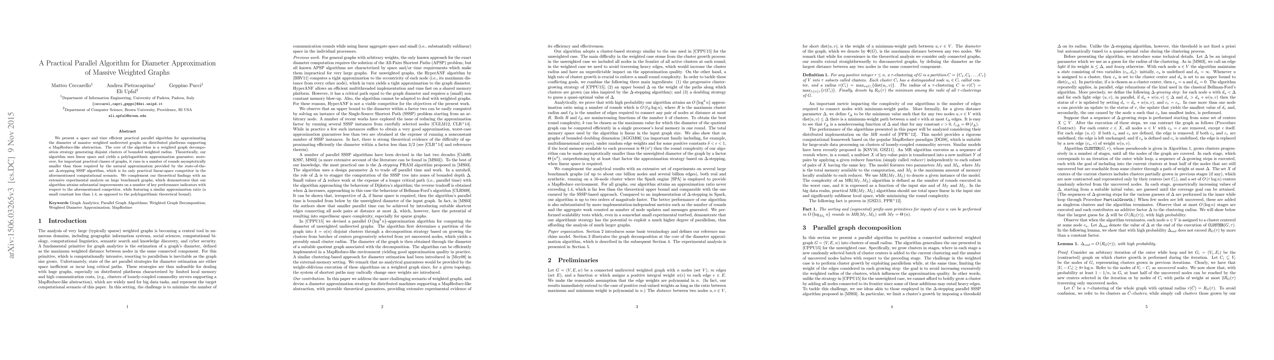 This paper introduces a parallel algorithm for approximating the diameter of large weighted graphs, utilizing a space-efficient graph decomposition strategy. The algorithm achieves linear space usage and polylogarithmic approximation, outperforming the state-of-the-art $\Delta$-stepping SSSP algorithm in terms of round complexity and demonstrating significant practical improvements in experiments.