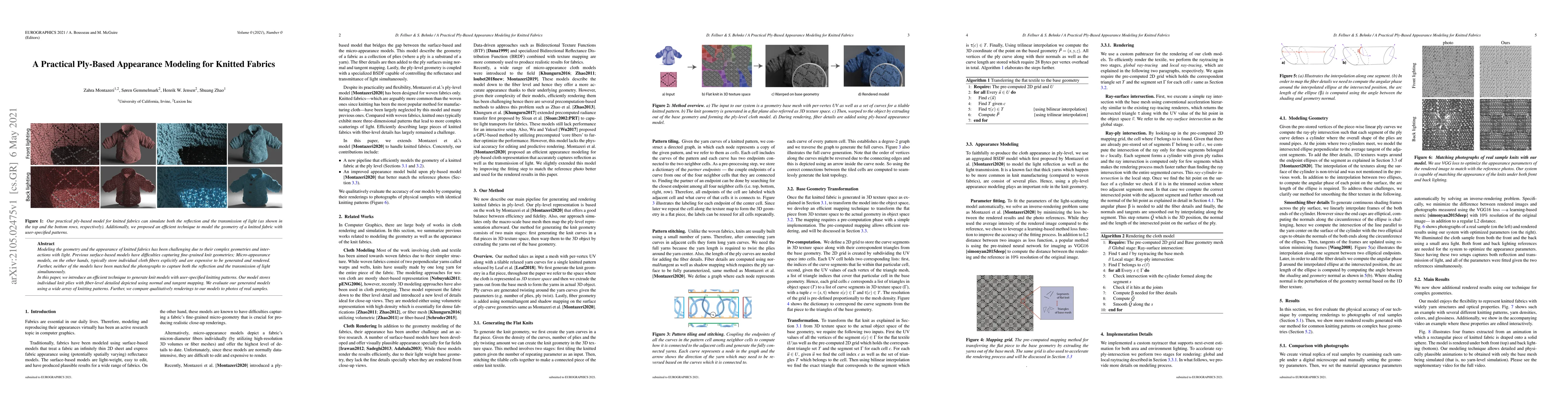 Modeling the geometry and the appearance of knitted fabrics has been challenging due to their complex geometries and interactions with light. Previous surface-based models have difficulties capturing fine-grained knit geometries; Micro-appearance models, on the other hands, typically store individual cloth fibers explicitly and are expensive to be generated and rendered. Further, neither of the models have been matched the photographs to capture both the reflection and the transmission of light simultaneously. In this paper, we introduce an efficient technique to generate knit models with user-specified knitting patterns. Our model stores individual knit plies with fiber-level detailed depicted using normal and tangent mapping. We evaluate our generated models using a wide array of knitting patterns. Further, we compare qualitatively renderings to our models to photos of real samples.