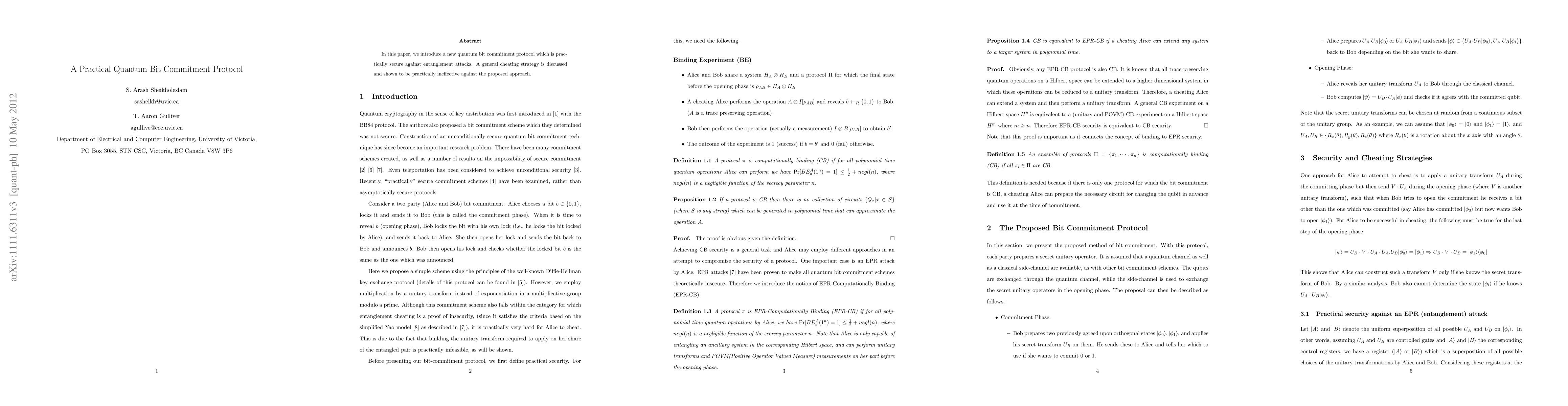 Summary: This paper presents a new quantum bit commitment protocol that effectively safeguards against entanglement attacks, demonstrating that general cheating strategies are practically ineffective against the proposed method.