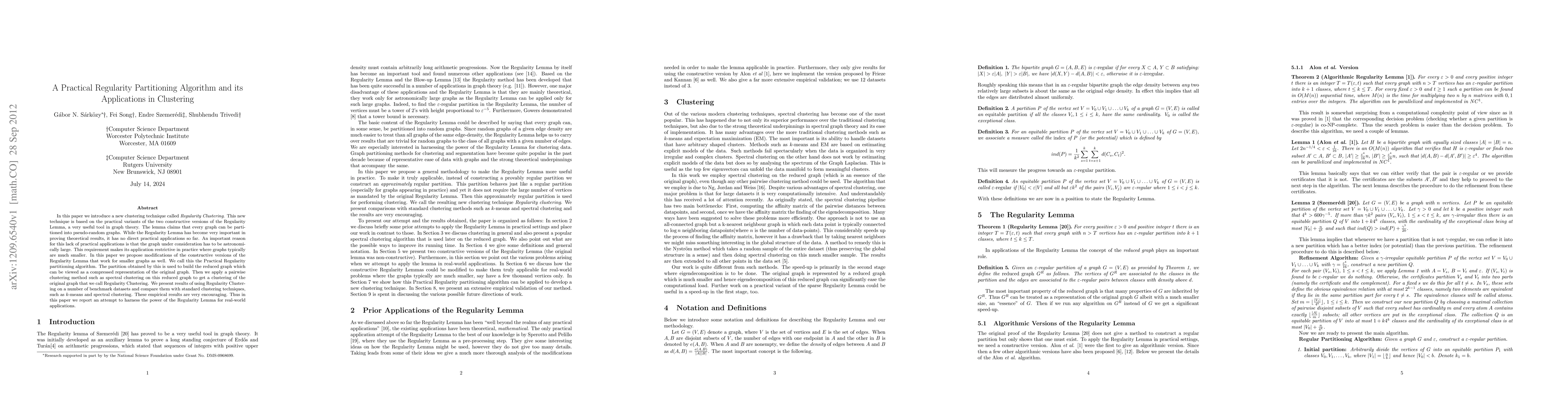 This paper introduces a new clustering technique called Regularity Clustering, which leverages modified versions of the Regularity Lemma to partition graphs into pseudo-random graphs, enabling practical applications on smaller graphs. The technique shows promising results when compared to standard clustering methods on benchmark datasets.