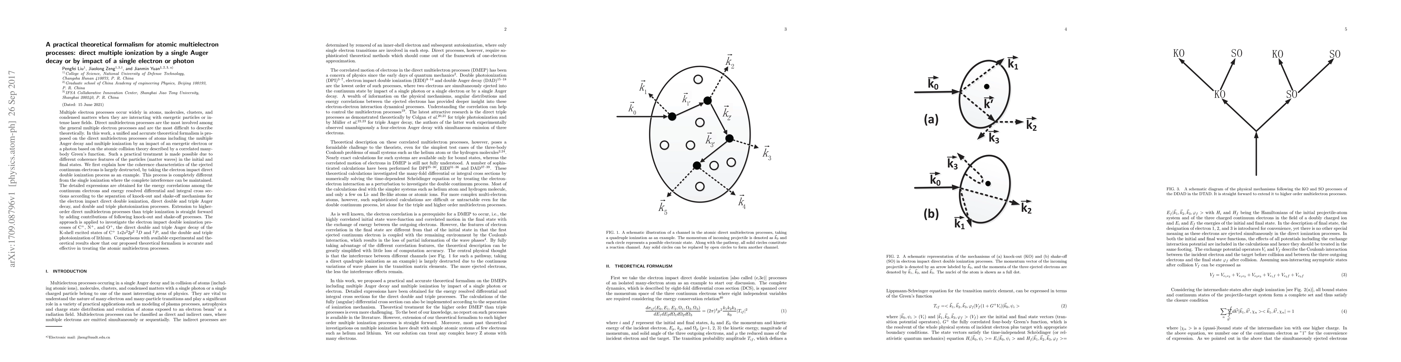 Multiple electron processes occur widely in atoms, molecules, clusters, and condensed matters when they are interacting with energetic particles or intense laser fields. In this work, a unified and accurate theoretical formalism is proposed on the direct multielectron processes of atoms including the multiple Auger decay and multiple ionization by an impact of an energetic electron or a photon based on the atomic collision theory described by a correlated many-body Green's function. Such a practical treatment is made possible due to different coherence features of the particles (matter waves) in the initial and final states. We first explain how the coherence characteristics of the ejected continuum electrons is largely destructed, by taking the electron impact direct double ionization process as an example. This process is completely different from the single ionization where the complete interference can be maintained. The detailed expressions are obtained for the energy correlations among the continuum electrons and energy resolved differential and integral cross sections according to the separation of knock-out and shake-off mechanisms for the electron impact direct double ionization, direct double and triple Auger decay, and double and triple photoionization processes. The approach is applied to investigate the electron impact double ionization processes of C$^+$, N$^+$, and O$^+$, the direct double and triple Auger decay of the K-shell excited states of C$^{+}$ $1s2s^22p^2$ $^2D$ and $^2P$, and the double and triple photoionization of lithium. Comparisons with available experimental and theoretical results show that our proposed theoretical formalism is accurate and effective in treating the atomic multielectron processes.