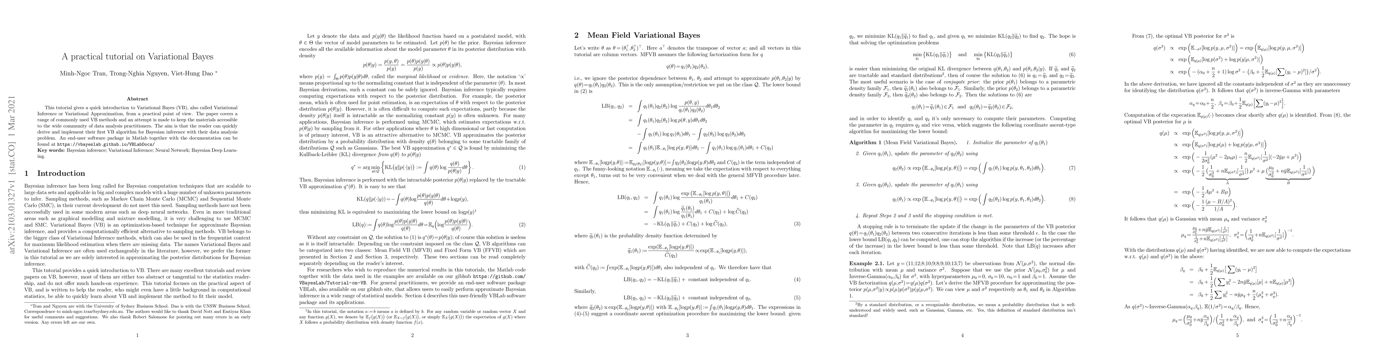 This tutorial gives a quick introduction to Variational Bayes (VB), also called Variational Inference or Variational Approximation, from a practical point of view. The paper covers a range of commonly used VB methods and an attempt is made to keep the materials accessible to the wide community of data analysis practitioners. The aim is that the reader can quickly derive and implement their first VB algorithm for Bayesian inference with their data analysis problem. An end-user software package in Matlab together with the documentation can be found at https://vbayeslab.github.io/VBLabDocs/