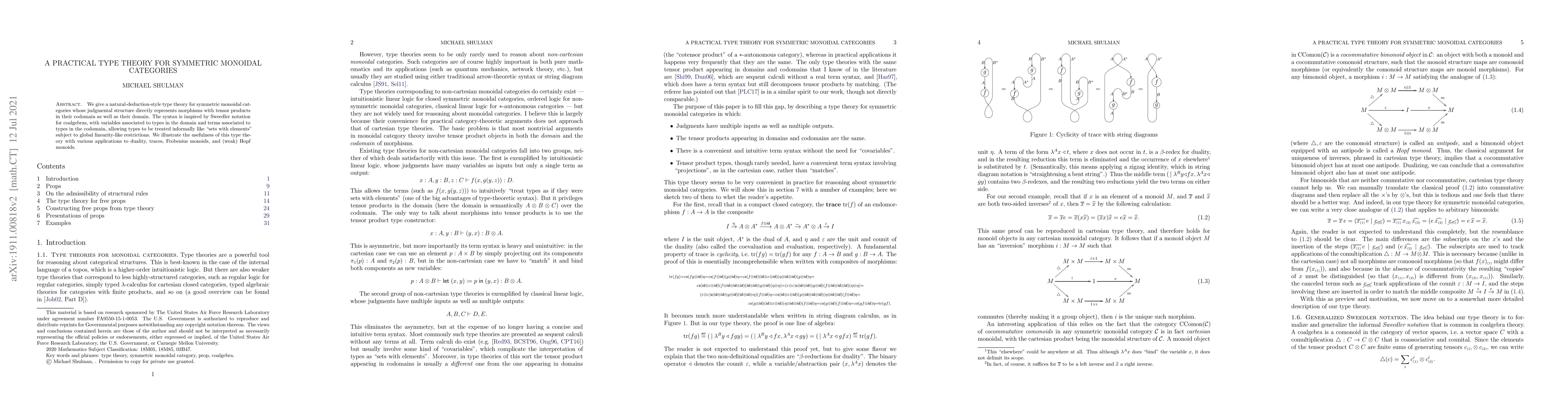 This paper presents a natural-deduction-style type theory for symmetric monoidal categories, using Sweedler notation to treat types as "sets with elements" under global linearity, and applies it to illustrate concepts in duality, traces, Frobenius monoids, and weak Hopf monoids.