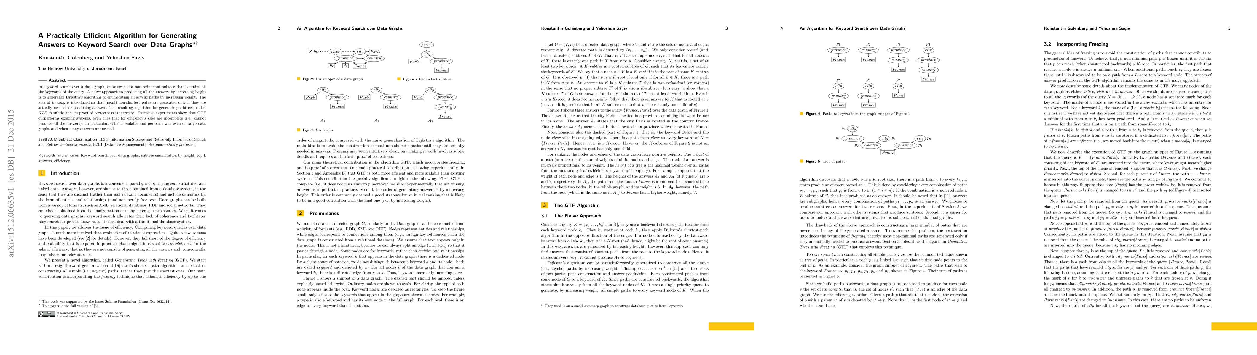 This work presents a practical and efficient algorithm (GTF) for generating answers to keyword search over data graphs, which is complete and avoids unnecessary work by constructing non-minimal paths only when needed.