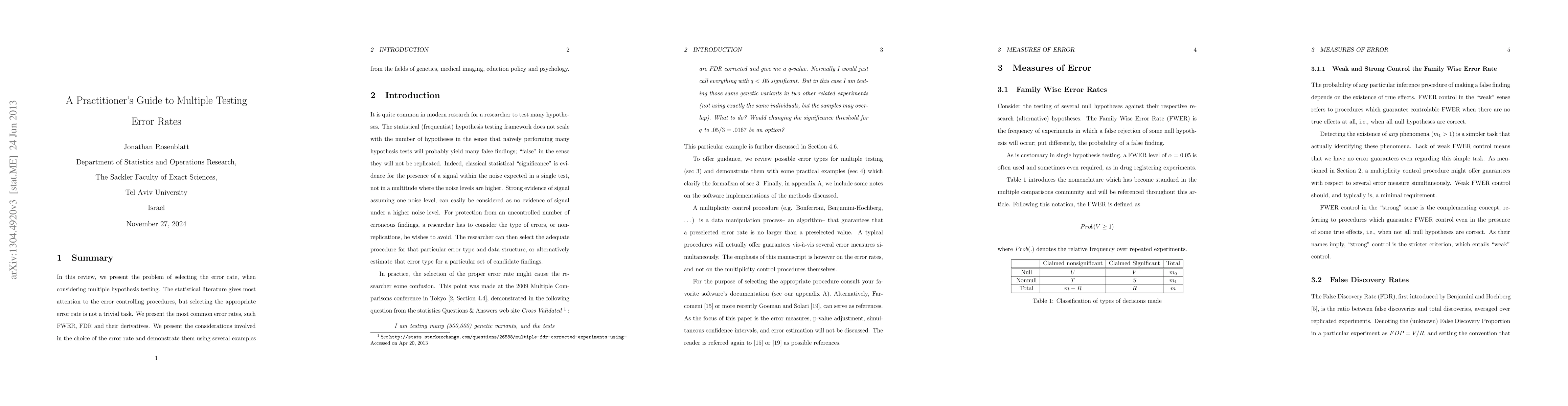 It is quite common in modern research, for a researcher to test many hypotheses. The statistical (frequentist) hypothesis testing framework, does not scale with the number of hypotheses in the sense that naively performing many hypothesis tests will probably yield many false findings. Indeed, statistical "significance" is evidence for the presence of a signal within the noise expected in a single test, not in a multitude. In order to protect himself from an uncontrolled number of erroneous findings, a researcher has to consider of the type or errors he wishes to avoid and select the adequate procedure for that particular error type and data structure. A quick search of the tag [multiple-comparisons] in the statistics Questions & Answers web site Cross Validates (http://stats.stackexchange.com) demonstrates the amount of confusion this task can actually cause. This was also a point made at the 2009 Multiple Comparisons conference in Tokyo. In an attempt to offer guidance, we review possible error types for multiple testing, and demonstrate them with some practical examples, which clarify the formalism. Finally, we include some notes on the software implementations of the methods discussed. The emphasis of this manuscript is on the error-rates, and not on the procedures themselves. We do try to name several procedures in this manuscript where appropriate. P-value adjustment will not be discussed as it is procedure specific. I.e., it is the choice of a procedure that defines the p-value adjustment, and not the error rate itself. Simultaneous confidence intervals will, also, not be discussed.
