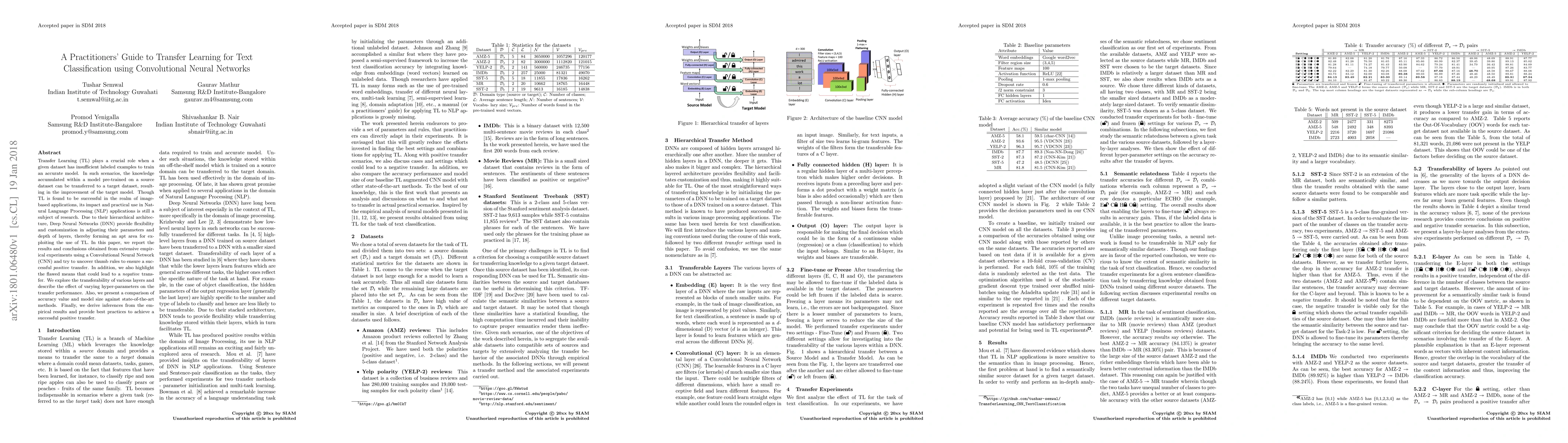 Transfer Learning (TL) plays a crucial role when a given dataset has insufficient labeled examples to train an accurate model. In such scenarios, the knowledge accumulated within a model pre-trained on a source dataset can be transferred to a target dataset, resulting in the improvement of the target model. Though TL is found to be successful in the realm of image-based applications, its impact and practical use in Natural Language Processing (NLP) applications is still a subject of research. Due to their hierarchical architecture, Deep Neural Networks (DNN) provide flexibility and customization in adjusting their parameters and depth of layers, thereby forming an apt area for exploiting the use of TL. In this paper, we report the results and conclusions obtained from extensive empirical experiments using a Convolutional Neural Network (CNN) and try to uncover thumb rules to ensure a successful positive transfer. In addition, we also highlight the flawed means that could lead to a negative transfer. We explore the transferability of various layers and describe the effect of varying hyper-parameters on the transfer performance. Also, we present a comparison of accuracy value and model size against state-of-the-art methods. Finally, we derive inferences from the empirical results and provide best practices to achieve a successful positive transfer.