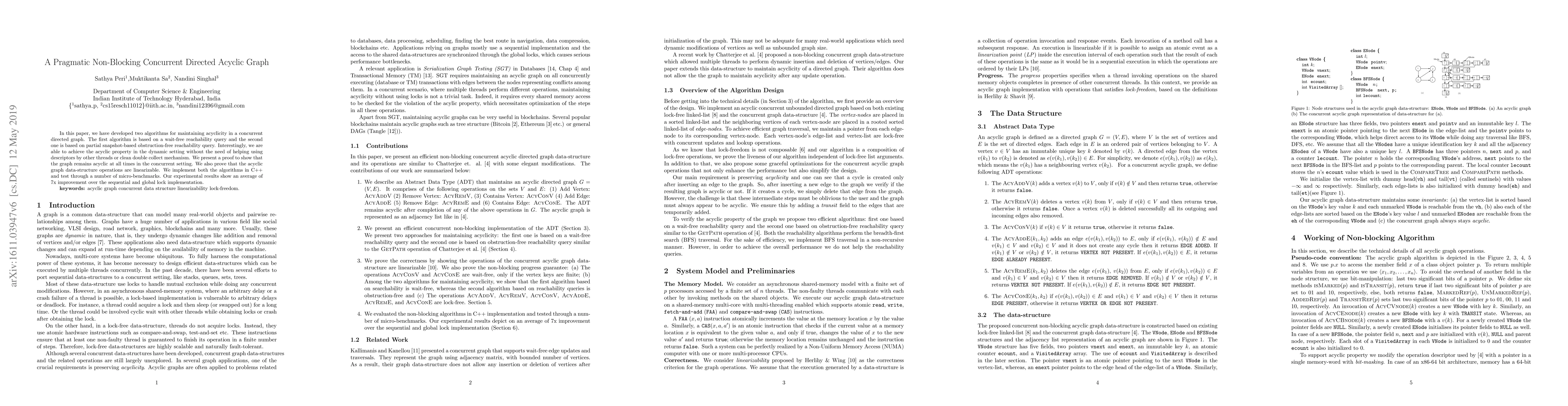 The paper presents two algorithms for maintaining acyclicity in a concurrent directed graph. These algorithms are based on wait-free reachability query and partial snapshot-based obstruction-free reachability query, respectively. The algorithms are implemented in C++ and tested through micro-benchmarks.