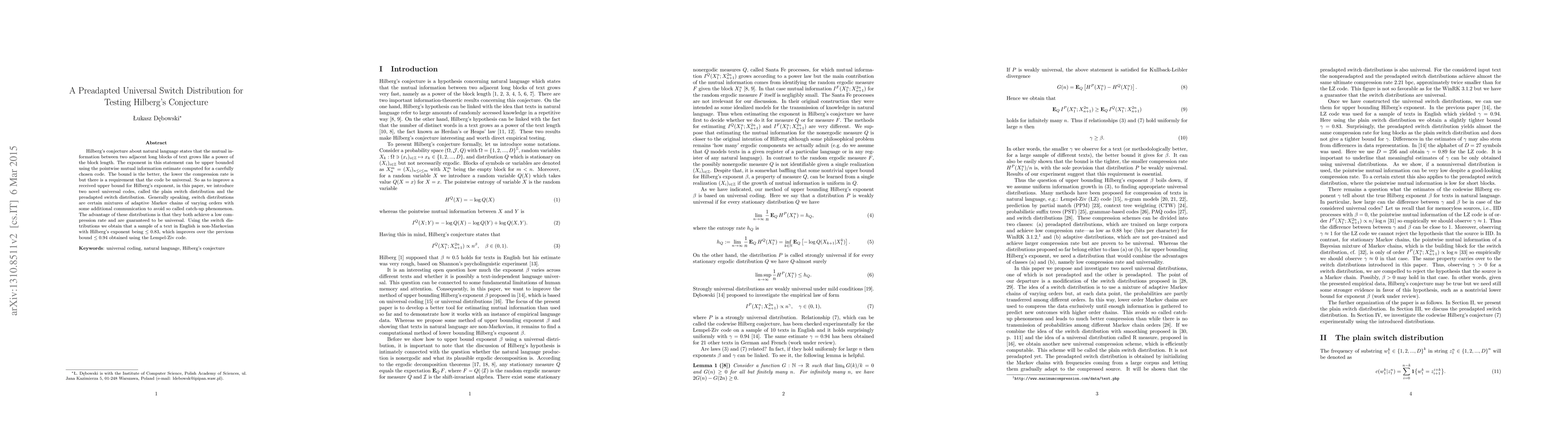 Hilberg's conjecture about natural language states that the mutual information between two adjacent long blocks of text grows like a power of the block length. The exponent in this statement can be upper bounded using the pointwise mutual information estimate computed for a carefully chosen code. The bound is the better, the lower the compression rate is but there is a requirement that the code be universal. So as to improve a received upper bound for Hilberg's exponent, in this paper, we introduce two novel universal codes, called the plain switch distribution and the preadapted switch distribution. Generally speaking, switch distributions are certain mixtures of adaptive Markov chains of varying orders with some additional communication to avoid so called catch-up phenomenon. The advantage of these distributions is that they both achieve a low compression rate and are guaranteed to be universal. Using the switch distributions we obtain that a sample of a text in English is non-Markovian with Hilberg's exponent being $\le 0.83$, which improves over the previous bound $\le 0.94$ obtained using the Lempel-Ziv code.