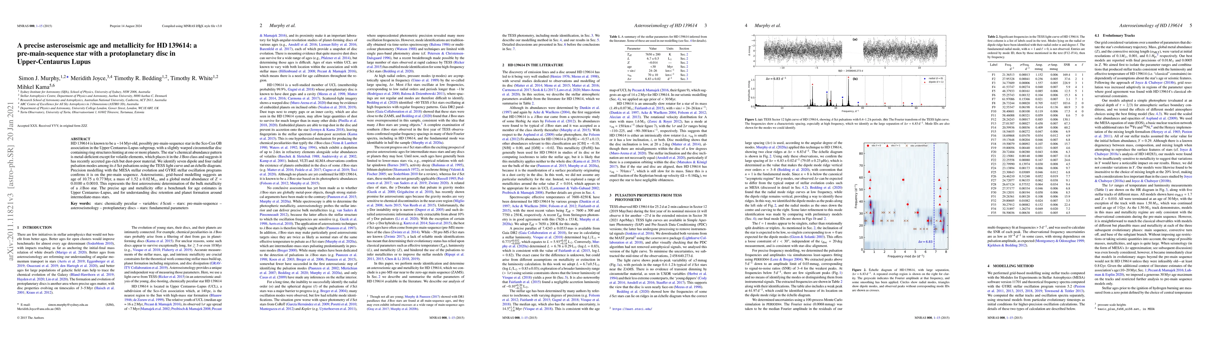 HD\,139614 is known to be a $\sim$14-Myr-old, possibly pre-main-sequence star in the Sco-Cen OB association in the Upper Centaurus-Lupus subgroup, with a slightly warped circumstellar disc containing ring structures hinting at one or more planets. The star's chemical abundance pattern is metal-deficient except for volatile elements, which places it in the $\lambda$ Boo class and suggests it has recently accreted gas-rich but dust-poor material. We identify seven dipole and four radial pulsation modes among its $\delta$ Sct pulsations using the TESS light curve and an \'echelle diagram. Precision modelling with the MESA stellar evolution and GYRE stellar oscillation programs confirms it is on the pre-main sequence. Asteroseismic, grid-based modelling suggests an age of $10.75\pm0.77$ Myr, a mass of $1.52\pm0.02$ M$_{\odot}$, and a global metal abundance of $Z=0.0100\pm0.0010$. This represents the first asteroseismic determination of the bulk metallicity of a $\lambda$ Boo star. The precise age and metallicity offer a benchmark for age estimates in Upper Centaurus--Lupus, and for understanding disc retention and planet formation around intermediate-mass stars.