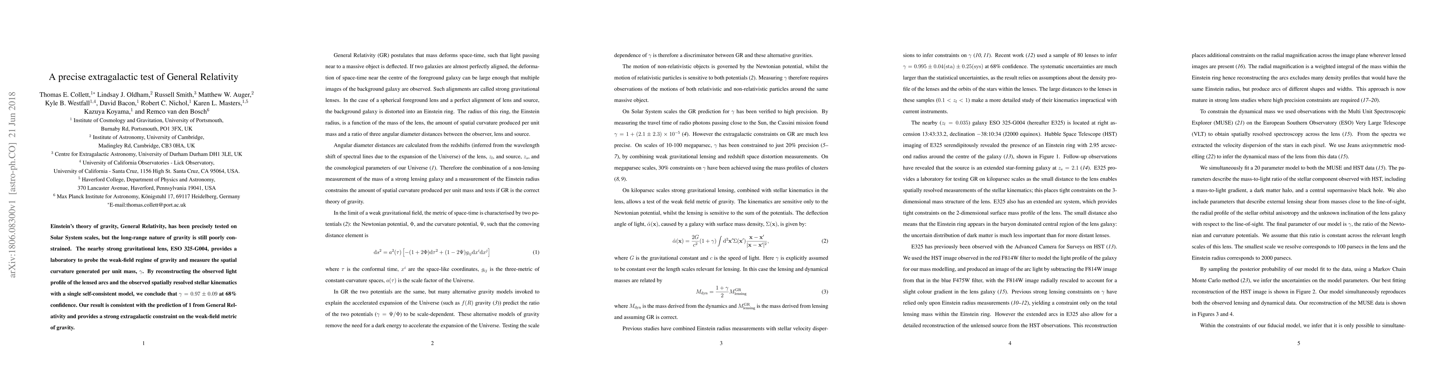 This study uses the strong gravitational lens ESO 325-G004 to test General Relativity's predictions at extragalactic scales. The analysis finds $\gamma = 0.97 \pm 0.09$ at 68% confidence, consistent with General Relativity's prediction of 1, thus providing a robust extragalactic constraint on the theory's weak-field metric.