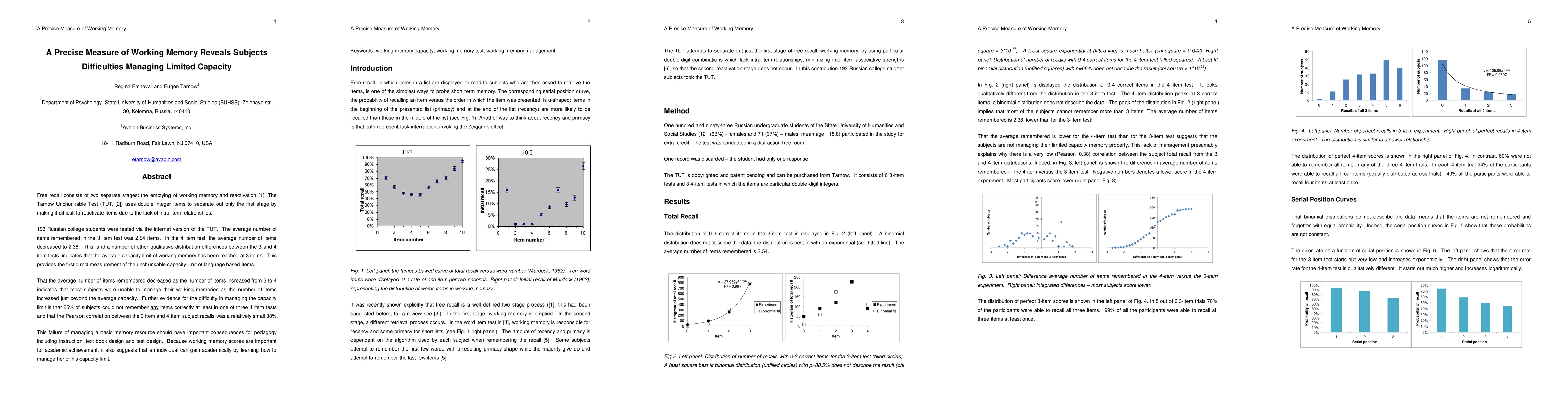 Free recall consists of two separate stages: the emptying of working memory and reactivation [1]. The Tarnow Unchunkable Test (TUT, [2]) uses double integer items to separate out only the first stage by making it difficult to reactivate items due to the lack of intra-item relationships. 193 Russian college students were tested via the internet version of the TUT. The average number of items remembered in the 3 item test was 2.54 items. In the 4 item test, the average number of items decreased to 2.38. This, and a number of other qualitative distribution differences between the 3 and 4 item tests, indicates that the average capacity limit of working memory has been reached at 3 items. This provides the first direct measurement of the unchunkable capacity limit of language based items. That the average number of items remembered decreased as the number of items increased from 3 to 4 indicates that most subjects were unable to manage their working memories as the number of items increased just beyond the average capacity. Further evidence for the difficulty in managing the capacity limit is that 25% of subjects could not remember any items correctly at least in one of three 4 item tests and that the Pearson correlation between the 3 item and 4 item subject recalls was a relatively small 38%. This failure of managing a basic memory resource should have important consequences for pedagogy including instruction, text book design and test design. Because working memory scores are important for academic achievement, it also suggests that an individual can gain academically by learning how to manage her or his capacity limit.