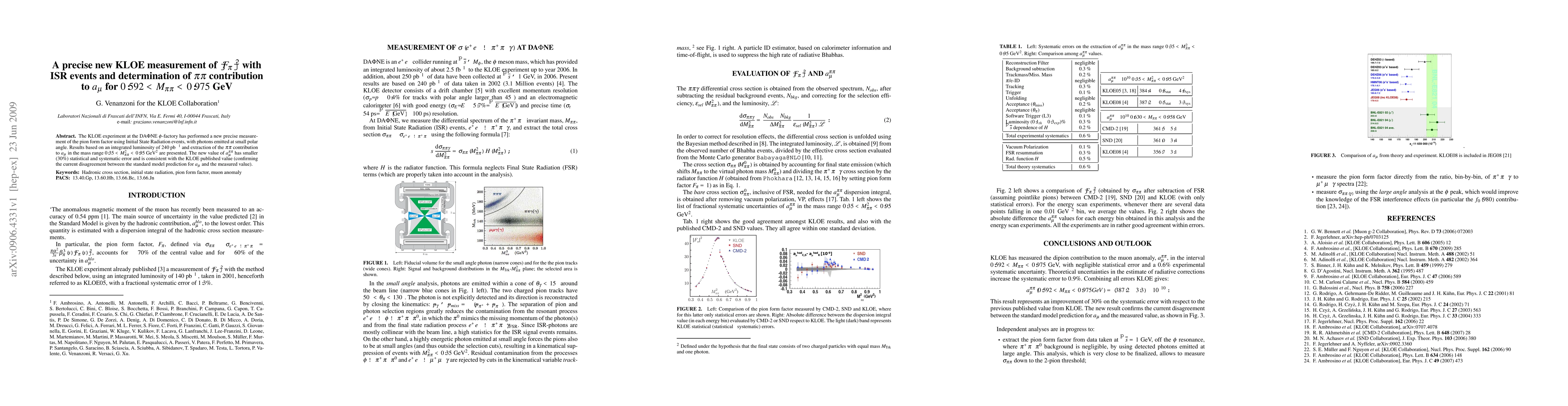 KLOE experiment at DAΦNE measured pion form factor precisely using ISR events, reducing error in ππ contribution to a_μ by 30%. New a^ππ_μ value agrees with previous KLOE result, maintaining discrepancy with SM a_μ prediction.