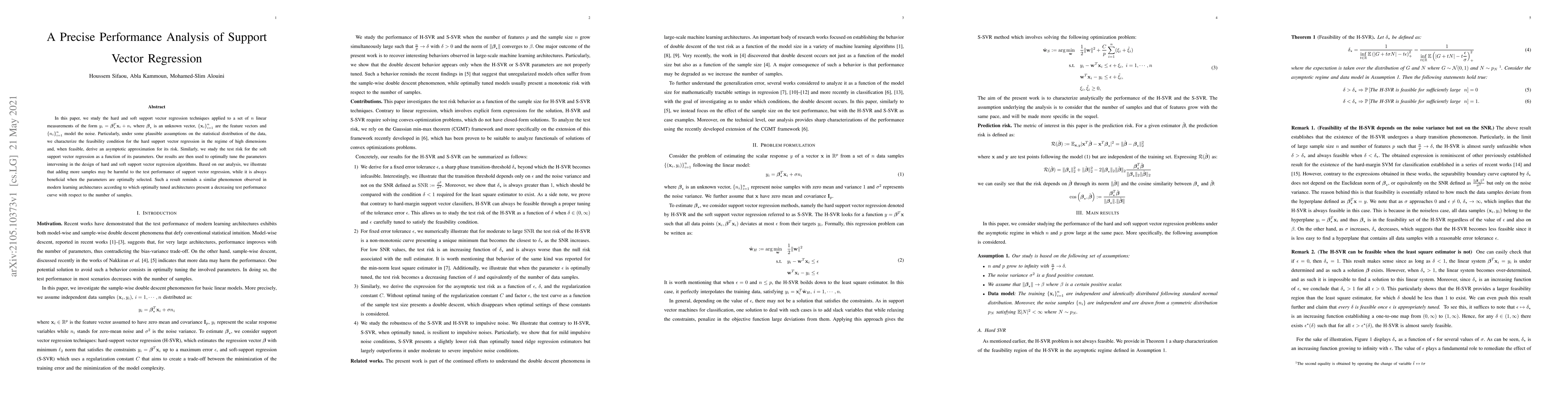 In this paper, we study the hard and soft support vector regression techniques applied to a set of $n$ linear measurements of the form $y_i=\boldsymbol{\beta}_\star^{T}{\bf x}_i +n_i$ where $\boldsymbol{\beta}_\star$ is an unknown vector, $\left\{{\bf x}_i\right\}_{i=1}^n$ are the feature vectors and $\left\{{n}_i\right\}_{i=1}^n$ model the noise. Particularly, under some plausible assumptions on the statistical distribution of the data, we characterize the feasibility condition for the hard support vector regression in the regime of high dimensions and, when feasible, derive an asymptotic approximation for its risk. Similarly, we study the test risk for the soft support vector regression as a function of its parameters. Our results are then used to optimally tune the parameters intervening in the design of hard and soft support vector regression algorithms. Based on our analysis, we illustrate that adding more samples may be harmful to the test performance of support vector regression, while it is always beneficial when the parameters are optimally selected. Such a result reminds a similar phenomenon observed in modern learning architectures according to which optimally tuned architectures present a decreasing test performance curve with respect to the number of samples.