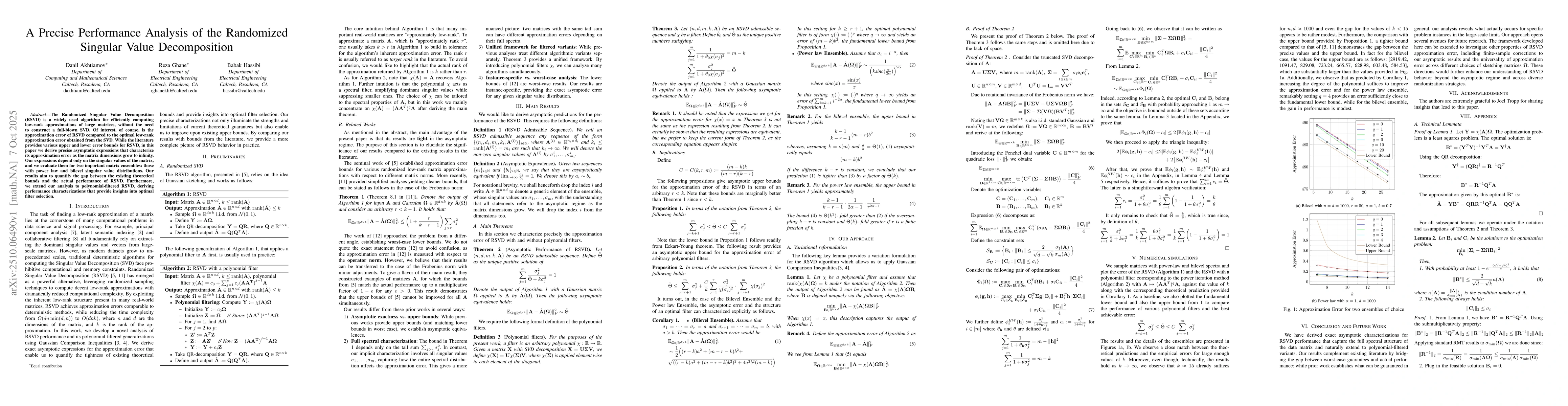 Formulates a variational reformulation of RSVD that enables application of Gaussian comparison inequalities, leading to exact asymptotic characterizations of approximation error for polynomial-filtered variants