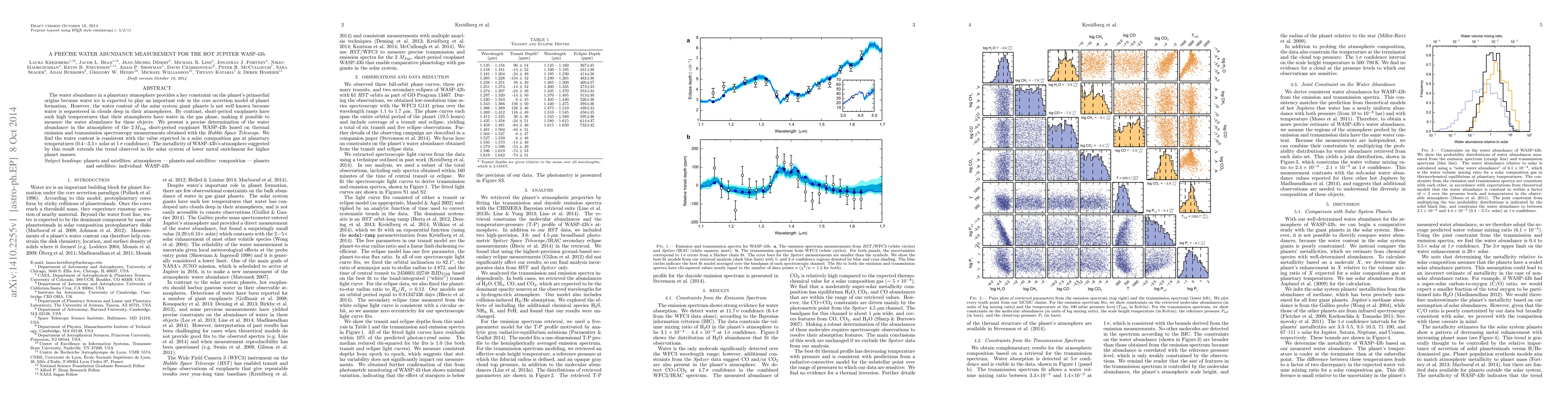 Researchers measured water abundance in WASP-43b's atmosphere using Hubble Space Telescope data, finding values consistent with a solar composition gas at planetary temperatures, suggesting lower metal enrichment for higher planet masses.